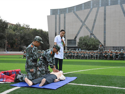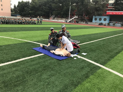 刘晋雯医生首先讲授了心肺复苏术的理论知识,并对急救的整个流程及注意事项进行了演示与详细讲解。随后,现场组织新生进行分组演练。在此次培训活动中,由承训部队教官配合实践操作培训演示,并让各连同学通过复苏模拟人进行了实际操作。