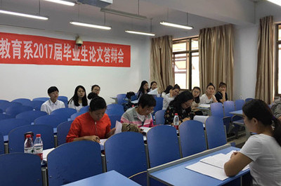 答辩会分四个小组进行,每个小组由4-5名教师组成评审委员会。在答辩过程中,首先由毕业生阐述论文选题缘由、意义及主要研究内容等,同时答辩委员会委员对每位毕业生的论文进行认真审阅,并结合毕业生的论文内容提出与该研究相关的问题,学生认真回答;随后,答辩委员就其答辩内容及其体现出的学术思想等方面进行了点评。整个答辩过程紧张而严肃,充分体现了教育系师生的专业知识水平与严谨的科学态度。