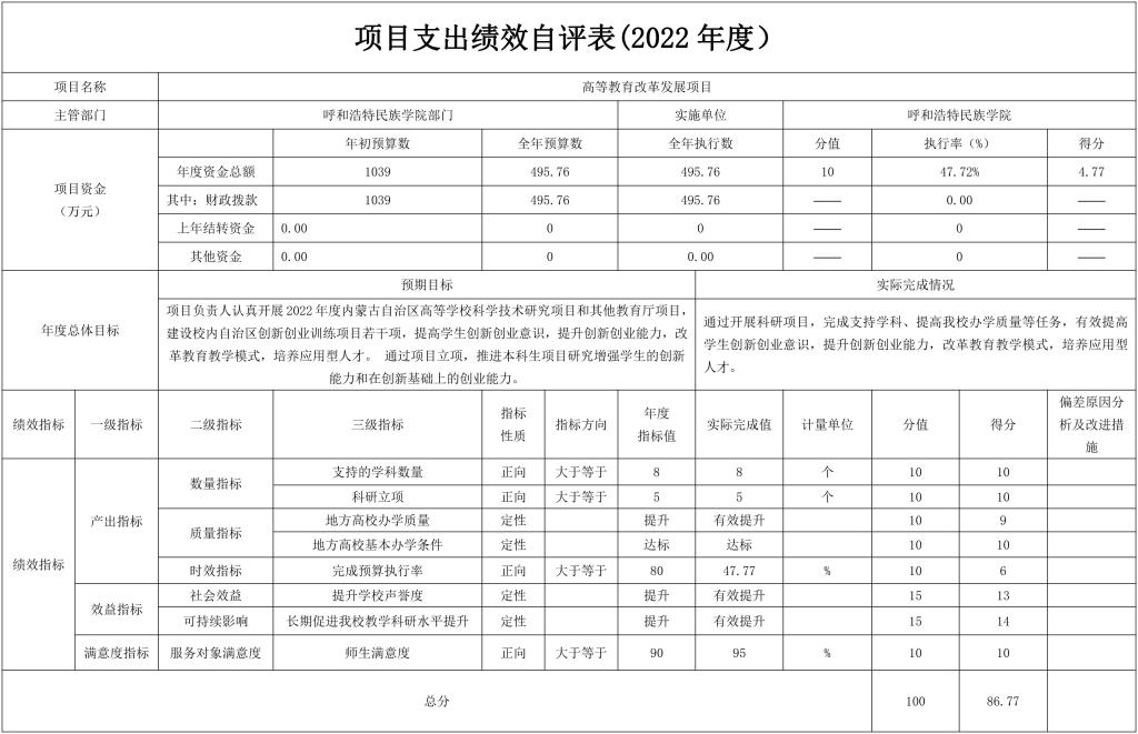 根据年初设定的绩效目标,项目自评得分86.77分。全年预算数为1039万元,执行数为495.76万元,完成预算的47.72%。学科建设、申硕工作、电子信息中心建设项目、智能互动研讨教室、硬件设施配备、科研经费、实验师教学设施配备、科研办公设施设备费用、人才引进费用等项目。绩效目标完成情况:支持的学科数量8人,科研立项5个,满足地方高校基本办学条件,师生满意度95%。