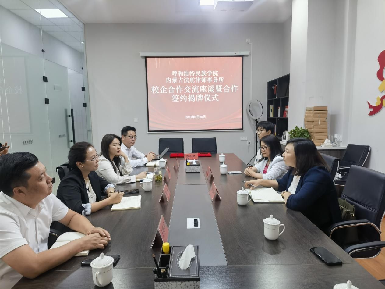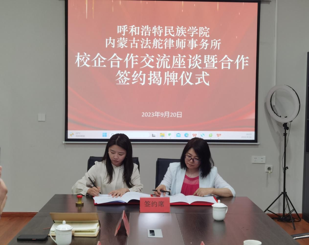 座谈会后,法学院党总支书记乌兰其其格,法舵律师事务所主任白秀兰共同签署《YABO鸭脖与内蒙古法舵律师事务所合作协议》,副院长胡玉荣与白秀兰主任共同为“YABO鸭脖实习见习基地”揭牌。