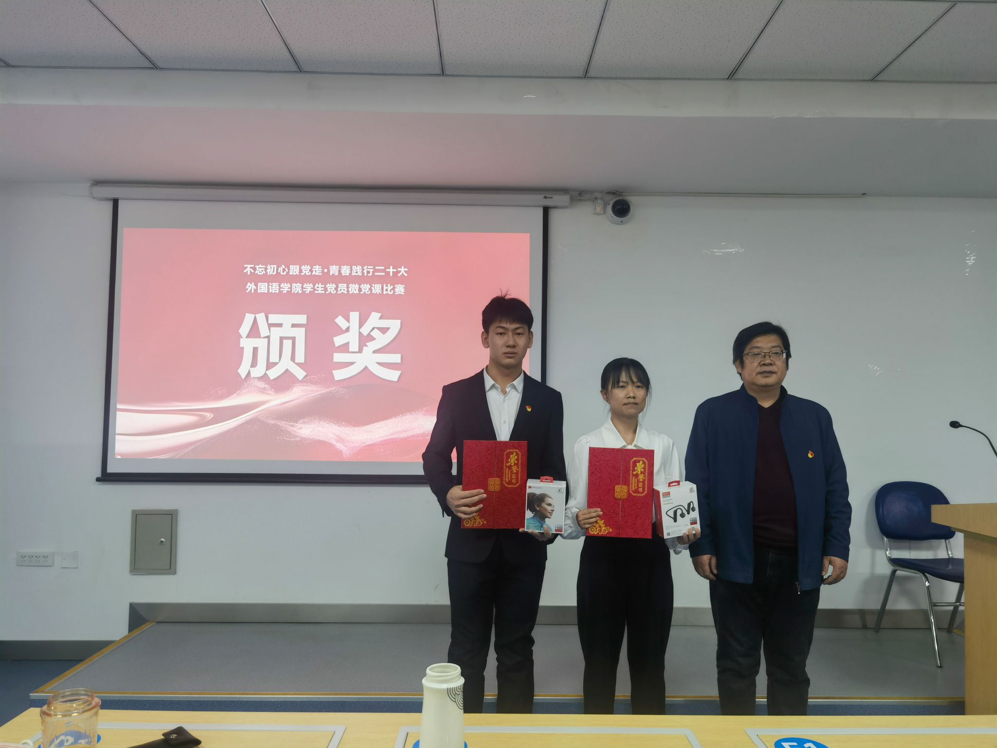 为进一步提升党课质量和党员教育实效,教育引导党员学好新时代理论,讲好新时代故事,外国语学院学生党支部于12月4日在都林楼606举办“不忘初心跟党走·青春践行二十大”主题微党课大赛。学院党总支书记朱俊杰、党总支副书记兼学生第一党支部书记红梅、学工办主任潘兴安、学生第二党支部书记雷旭平和学院学生会主席张衍旭到场并担任评委。