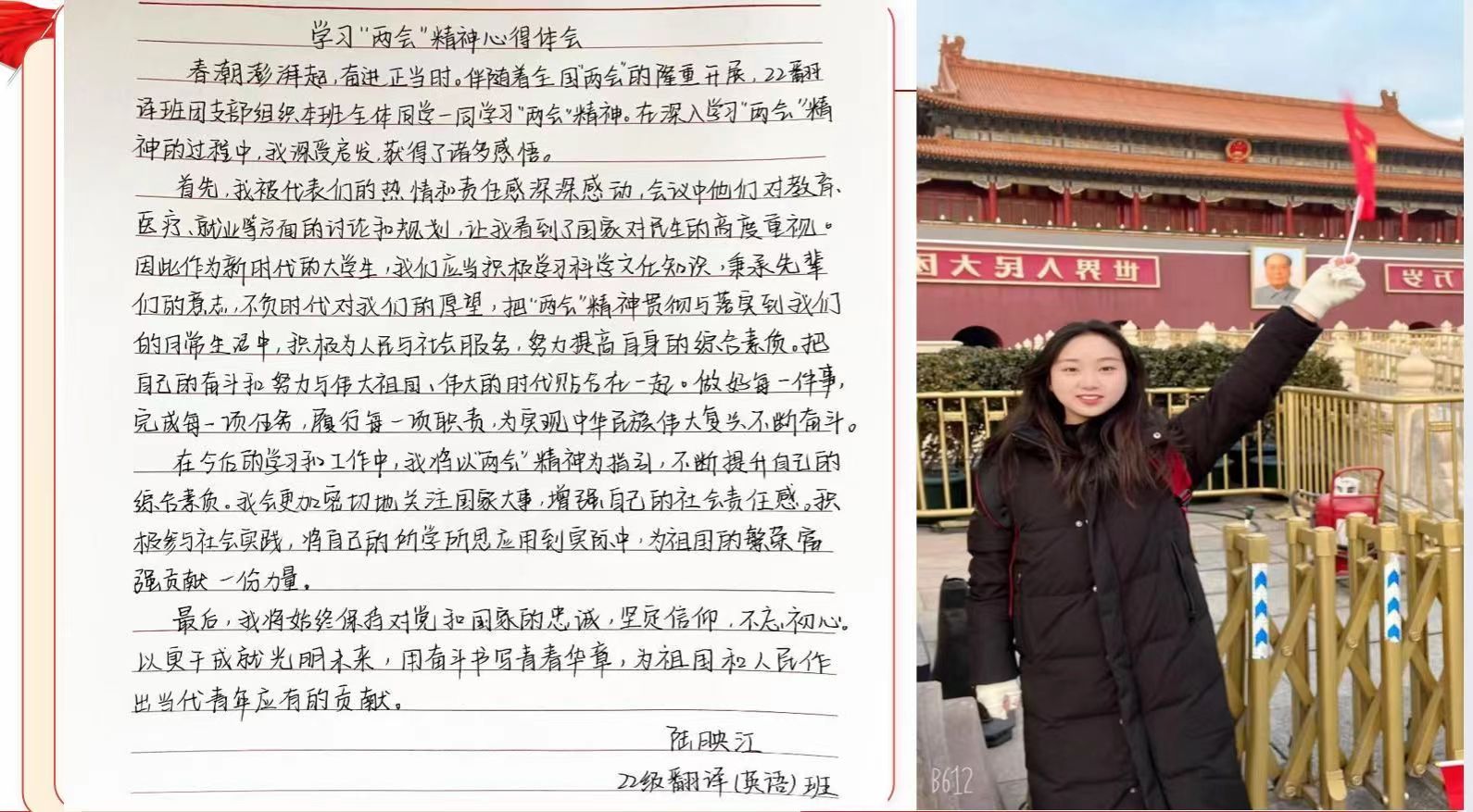 为更好的学习贯彻“两会”精神,把“两会”精神与学习生活结合起来,从而坚定理想信念,明确学习目标,外国语学院团总支于3月11日—3月14日组织全院团支部开展“学习两会精神,践行青年担当”主题团日活动。