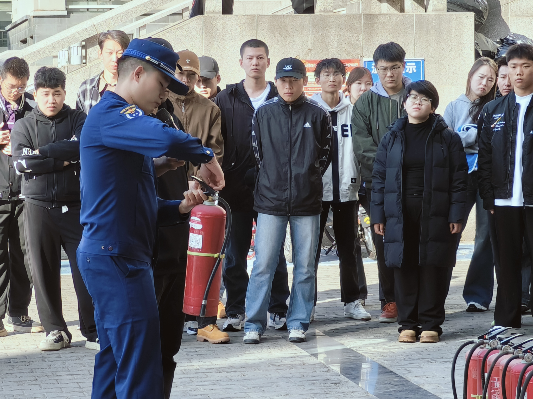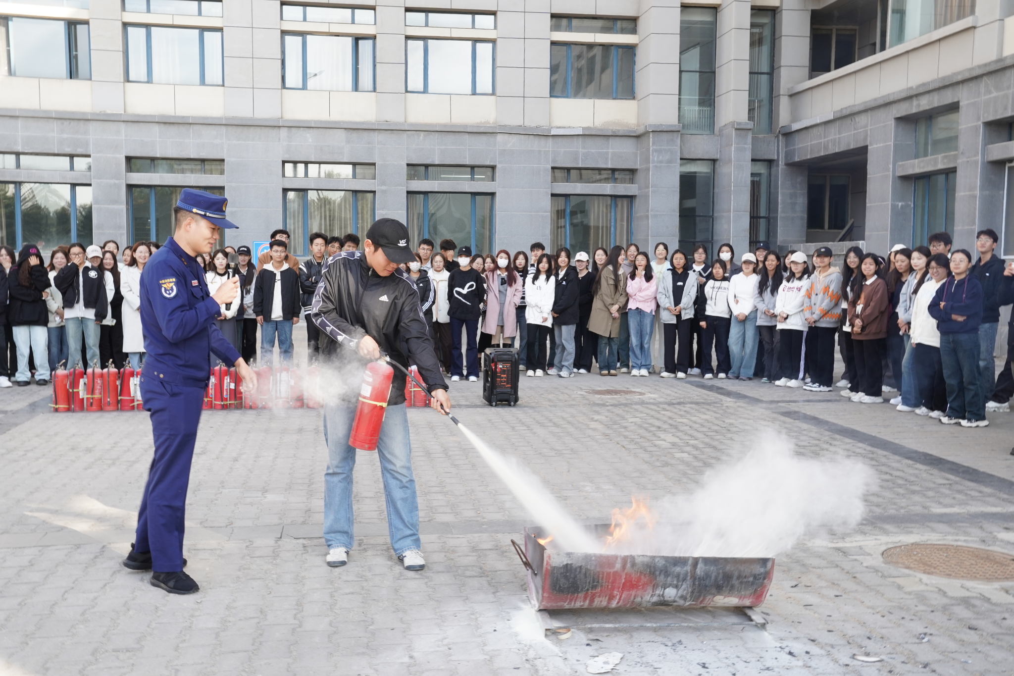 为加强全体师生的消防安全意识,预防和消除消防安全事故的发生,文学院联合校保卫处于10月12日在12号宿舍楼和尚智楼门前组织开展消防安全演练活动,并邀请公园西路消防救援站南丁、李黄超进行消防培训。文学院院长高娃、党总支副书记包冬梅、班主任、辅导员以及200余名在校生参与本次演练。