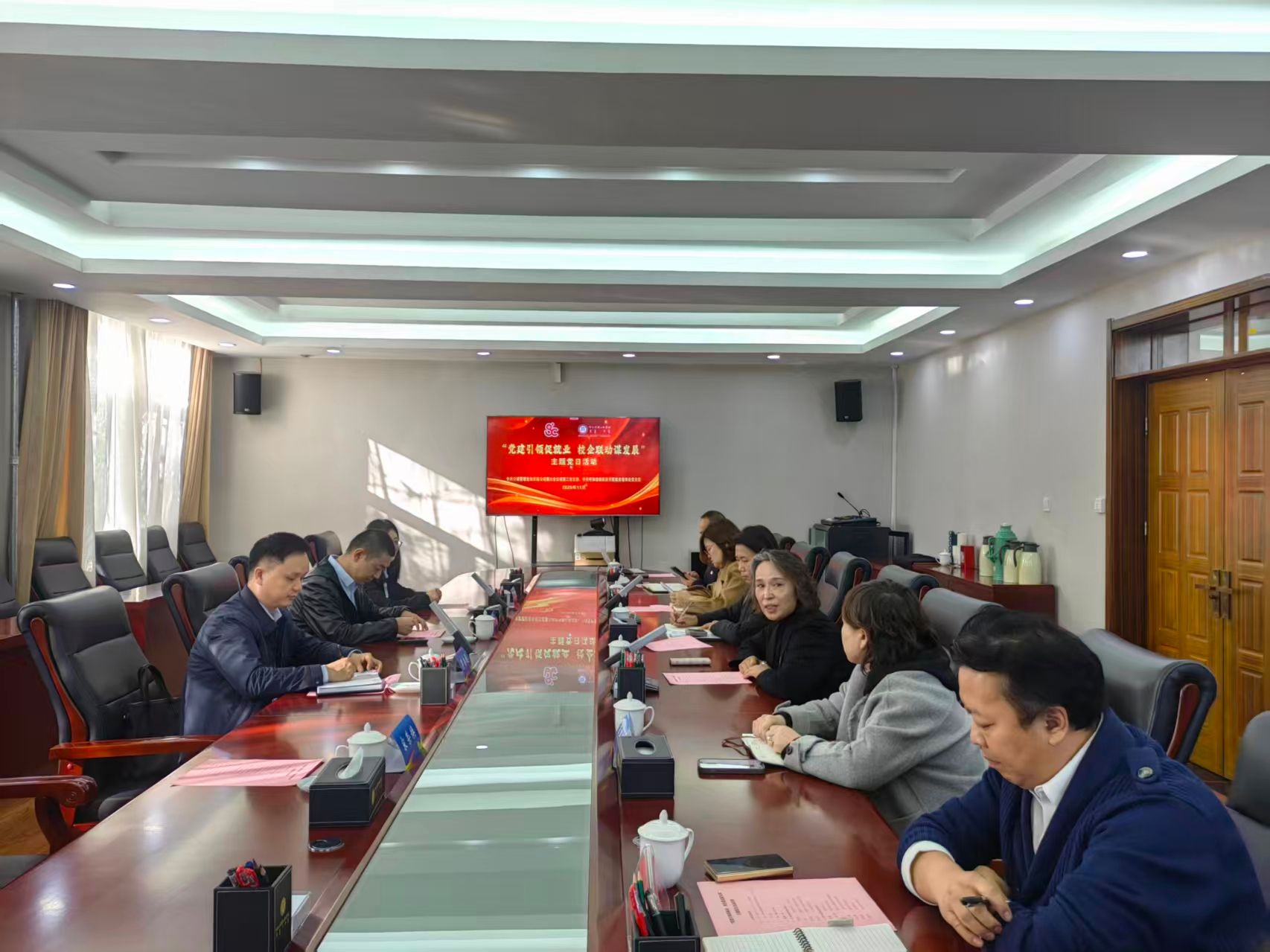 为深入贯彻落实铸牢中华民族共同体意识工作主线要求,充分发挥党建引领作用,搭建校企协同育人桥梁,助力学生高质量就业,11 月 13 日上午,公诚管理咨询有限公司第六分公司第三党支部与鸭脖就业指导处党支部以“党建引领促就业 校企联动谋发展”为主题,在学校铸牢中华民族共同体意识教育馆、办公楼2楼会议室联合开展主题党日活动。公诚管理咨询有限公司党支部书记、总经理罗杏通带领企业高管团队,学校教务处处长肖查娜、就业指导处处长娜仁其木格及相关学院负责人、就业指导处工作人员共同参会,活动由娜仁其木格主持。