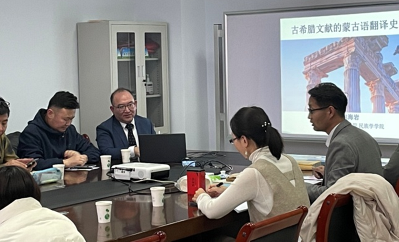 本场讲座中,包海岩博士以“古希腊文献的蒙古语翻译史回顾”为题,从文献学、语言学的角度分析了我国历史上的民族交往交流在世界范畴的发展,充分论述了文献资料与民族交往史研究的重要性。