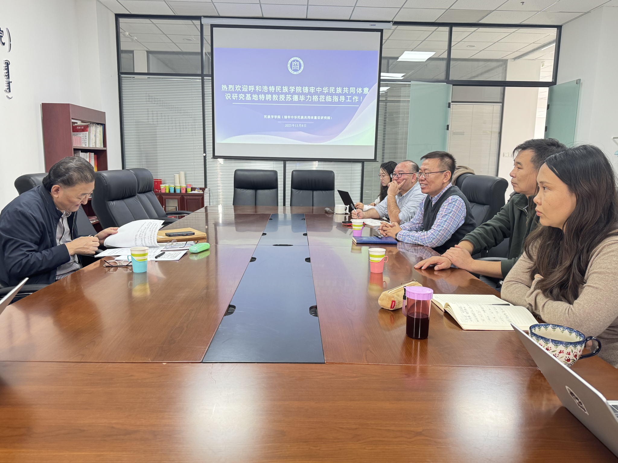 11月8日上午,铸牢中华民族共同体意识研究基地特聘教授、中央民族大学二级教授苏德毕力格莅临基地指导课题规划工作。会上,民族学学院(铸牢中华民族共同体意识研究院)党总支书记乌日根巴雅尔院简要介绍学院发展情况。民族学学院(铸牢中华民族共同体意识研究院)院长兼自治区四部委铸牢中华民族共同体意识研究基地常务副主任青斯琴汇报基地近年来在科学研究、合作交流以及硬件建设方面所开展的工作。
