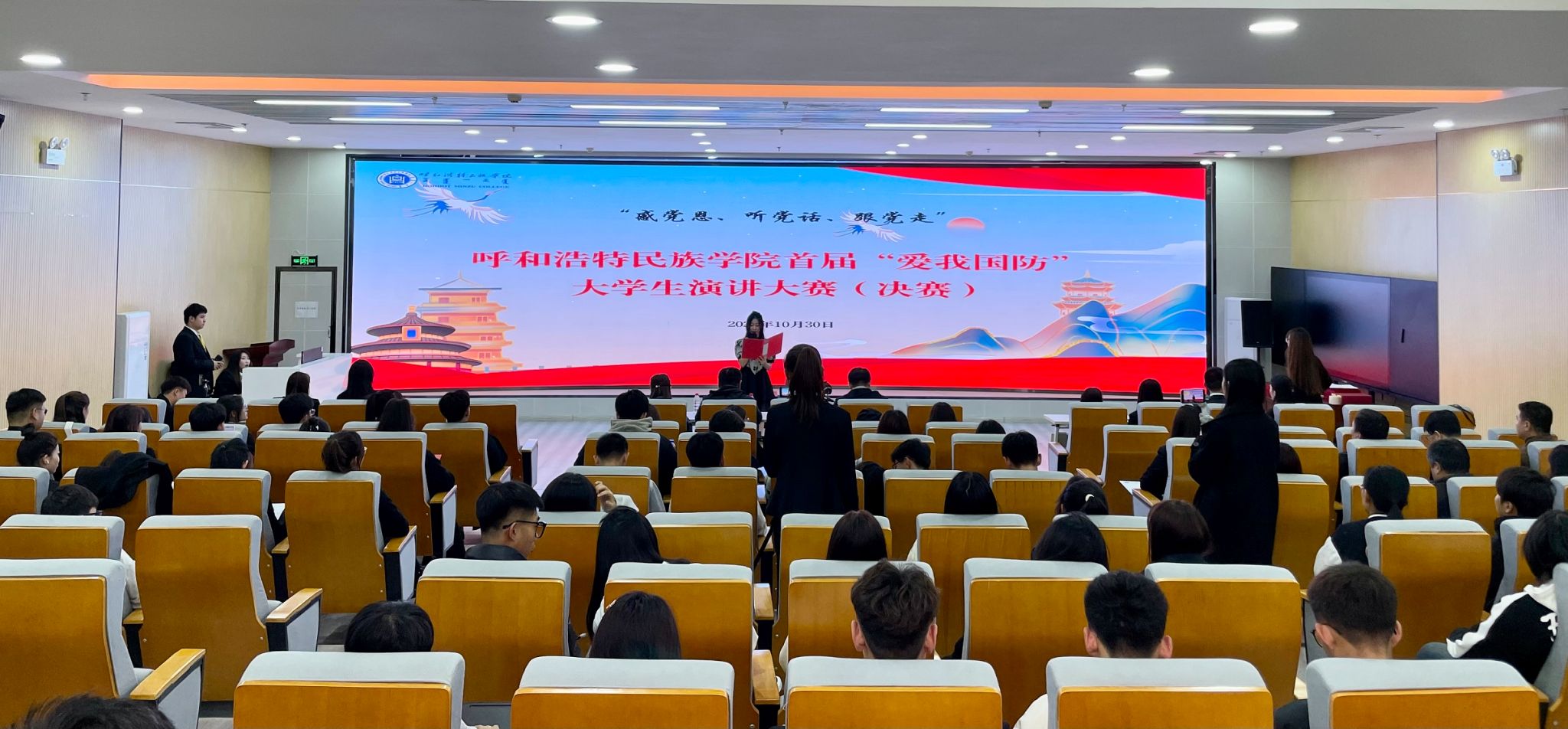 为深入学习贯彻党的二十大精神,贯彻落实习近平强军思想,不断增强国防教育的感召力和覆盖面,着力提升青年学生的国防意识和国防素养,大力营造支持国防建设、热爱人民军队的社会氛围,10月30日下午,鸭脖在北图书馆一楼报告厅举办了首届“爱我国防”大学生演讲大赛(决赛)。大赛邀请到经济管理学院党总支副书记李云、法学院党总支副书记姜鹏、创新创业学院副院长包桂英、党委学生工作部副部长李延茂担任评委。各学院辅导员、参赛选手、学生代表近130余人参加了此次活动。
