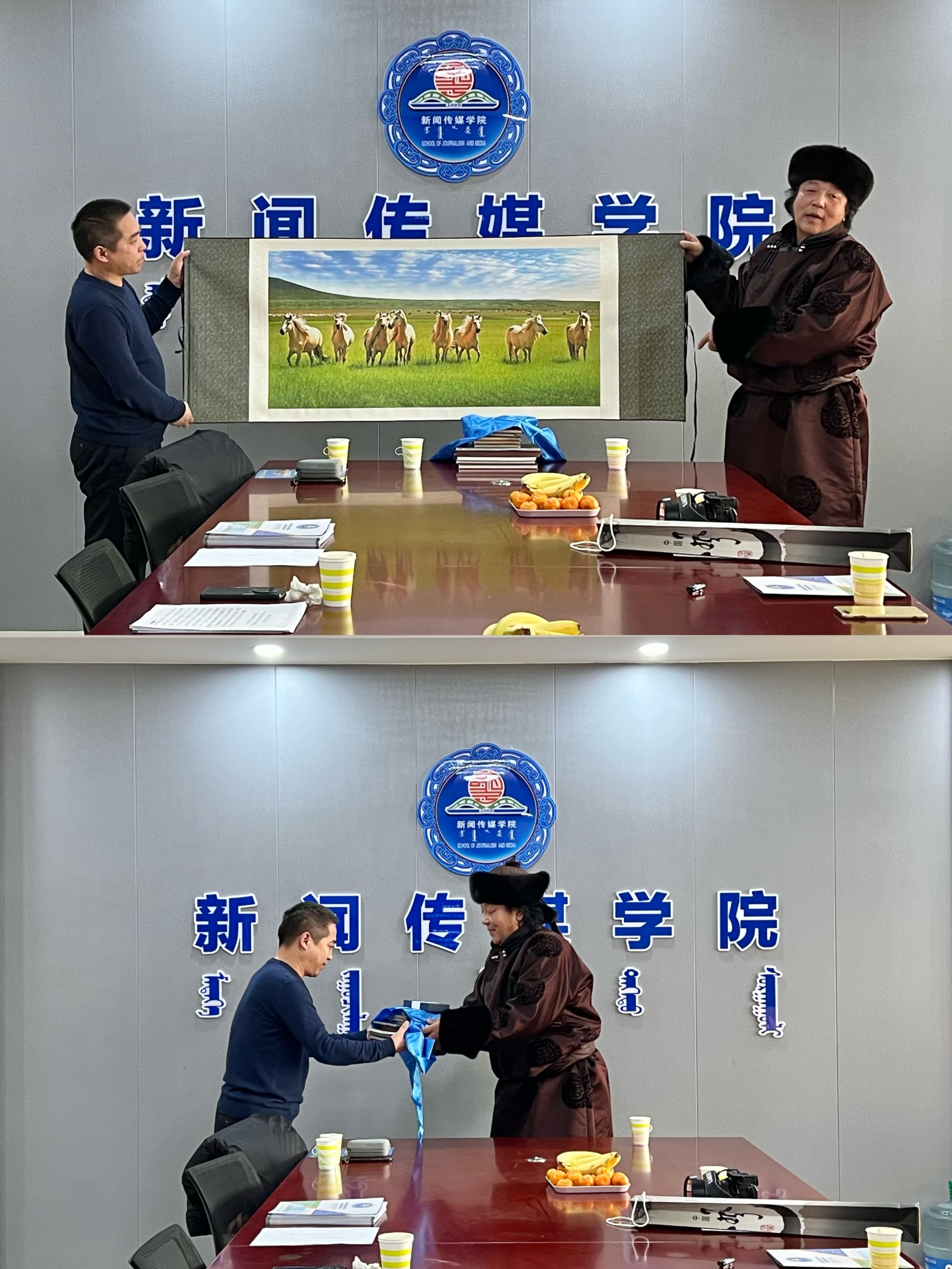 捐赠仪式上,90级播音班校友南吉德向学院赠予获奖摄影作品、画作及书籍。南吉德作为知名纪录片导演、锡林郭勒盟电影电视艺术家协会副主席,其影视作品曾荣获多项国内外大奖,如摄影作品《套马》于2019年荣获戛纳国际摄影节达盖尔金像奖,纪录片《国家的孩子》于2022年荣获自治区“五个一”工程奖。