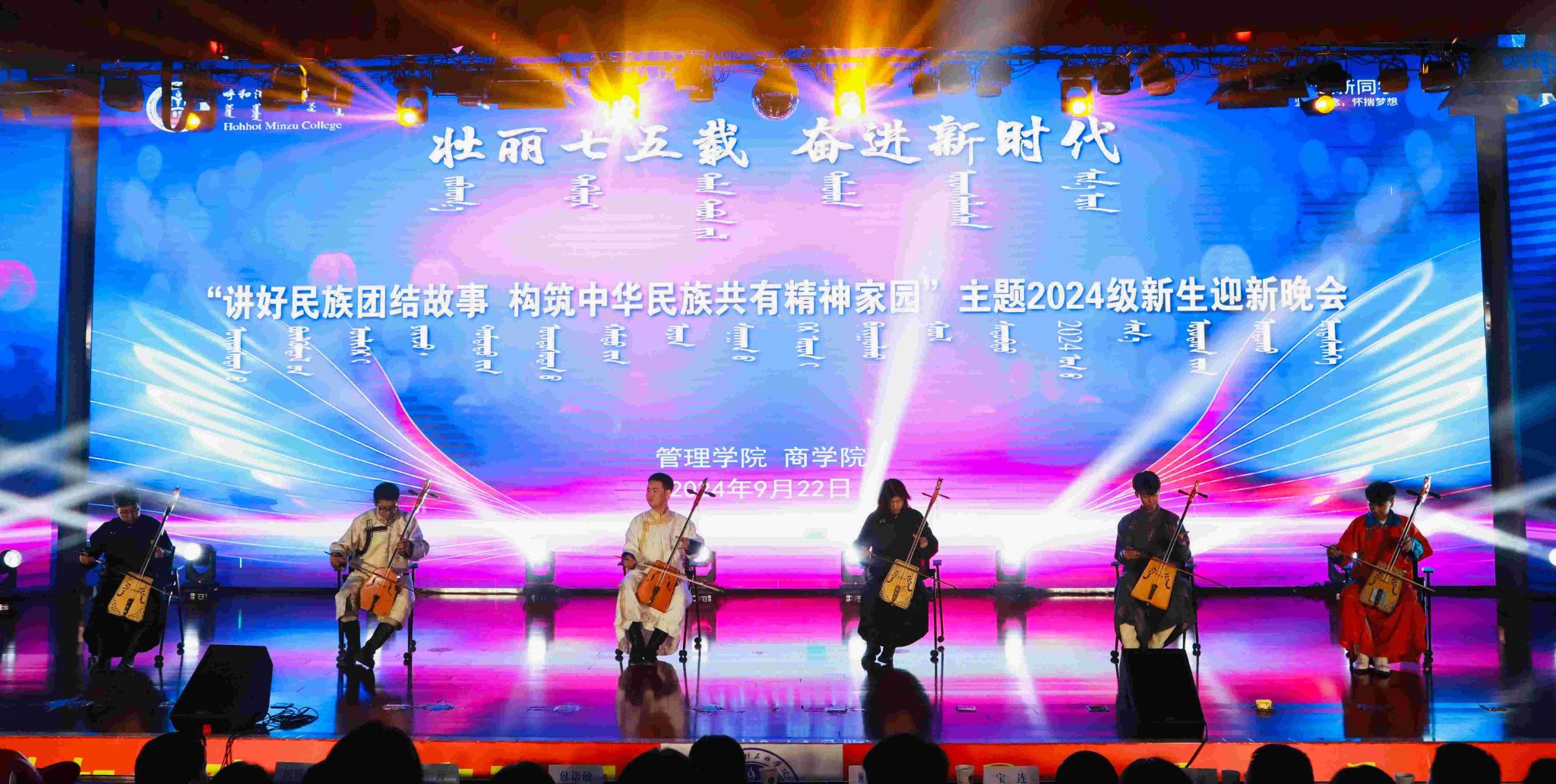 为迎接祖国75周年华诞,进一步增强铸牢中华民族共同体意识,深化民族团结意识,9月22日晚管理学院与商学院在北图书馆二楼报告厅联合举办“讲好民族团结故事构筑中华民族共有精神家园“主题2024级迎新晚会。管理学院与商学院领导班子、团委相关负责人、团总支、学工办负责人、2024级新生及在校生700余人观看演出。