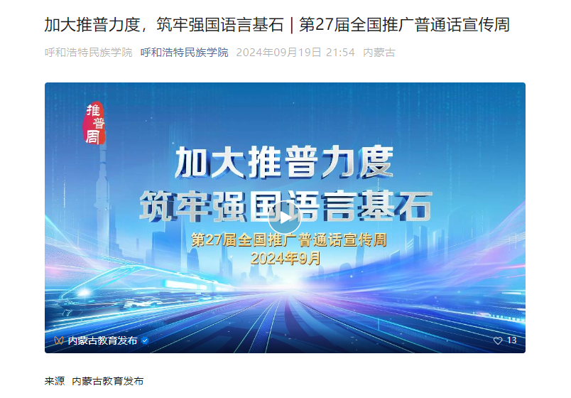 学校官方公众号分别发布《加大推普力度,筑牢强国语言基石 | 第27届全国推广普通话宣传周内蒙古自治区公益宣传片来啦》《加大推普力度 筑牢强国语言基石——第27届全国推广普通话宣传周海报来啦》《加大推普力度,筑牢强国语言基石 | 第27届全国推广普通话宣传周》《第27届全国推广普通话宣传周重点活动在新疆喀什举办》等推文在师生中进行广泛宣传。教学楼、宿舍楼等11块思政教育电子屏上投放第27届推普周宣传海报进行滚动宣传播放。各学院也结合专业特色印制海报、悬挂条幅,共同营造了浓厚的推普学习活动氛围。