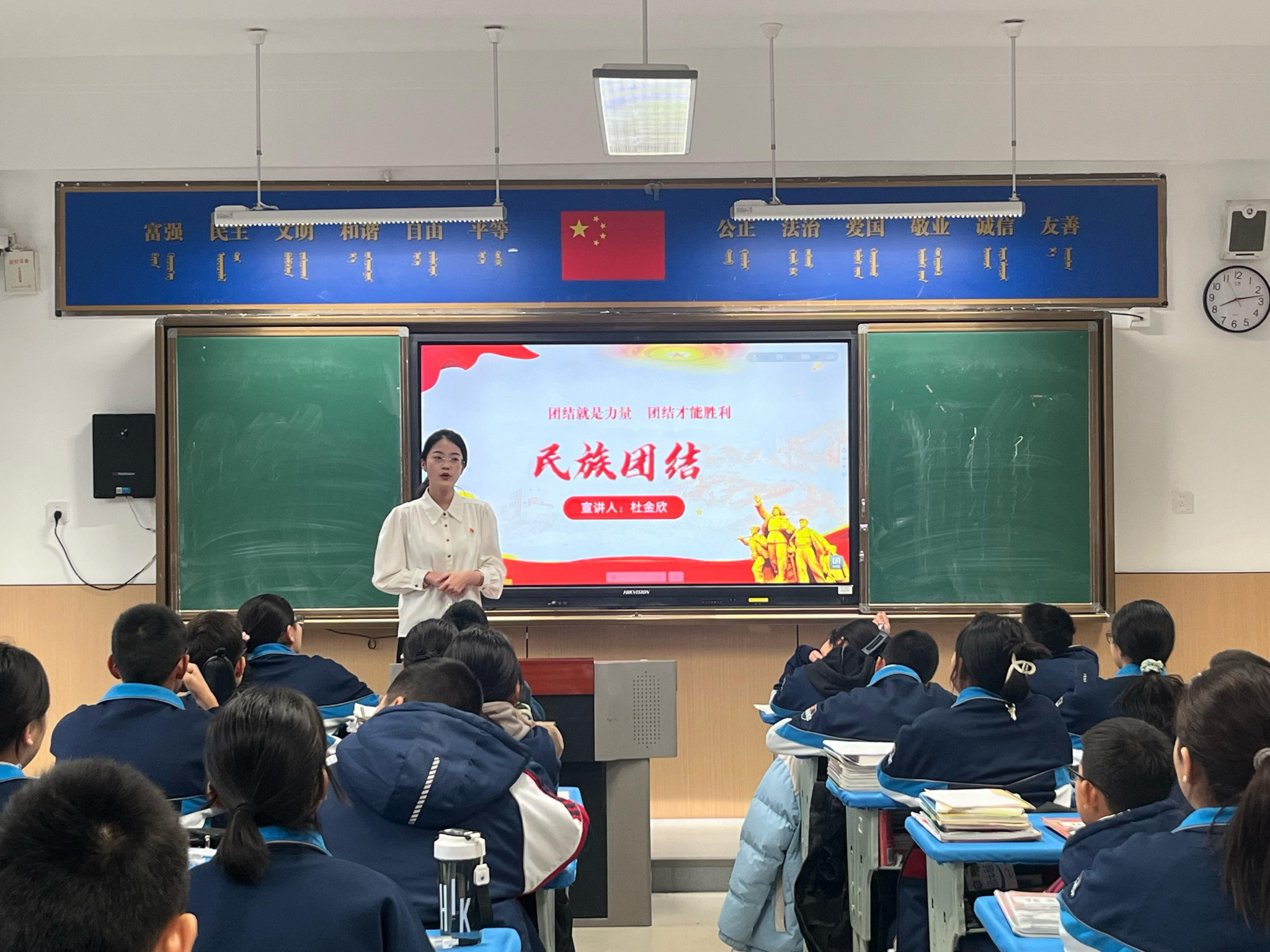 活动现场,宣讲团成员杜金欣以先进事例、典型人物为切入点,围绕民族团结的精神内涵和重要意义以及铸牢中华民族共同体意识等方面进行了深入宣讲,用通俗易懂的语言解读了民族团结政策,讲述感人至深的民族团结故事,营造了民族团结、同心同向、互助共进的良好氛围,让铸牢中华民族共同体意识根植于学生心灵深处。