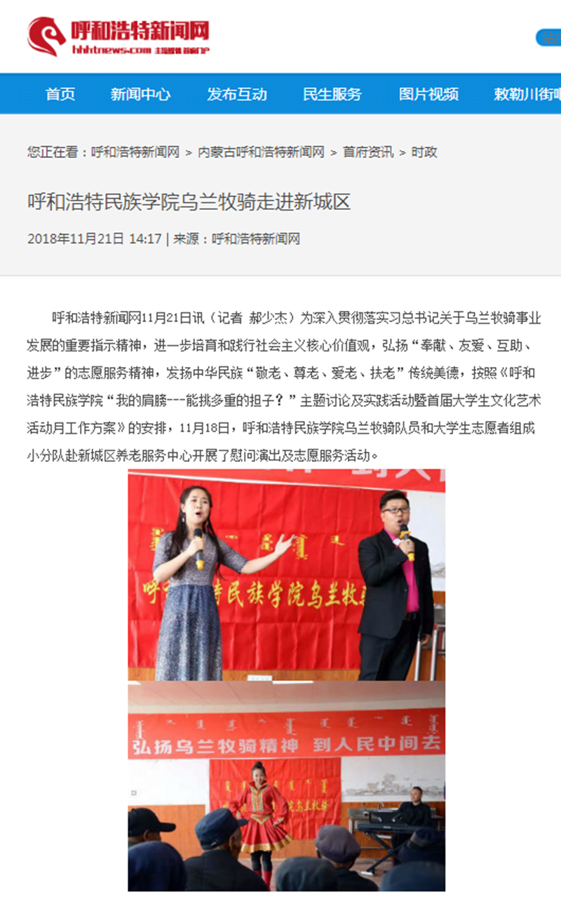 近日,中国新闻网、呼和浩特新闻网、大学生手机报先后报道鸭脖乌兰牧骑队员和大学生志愿者组成小分队赴新城区养老服务中心开展的慰问演出及志愿服务活动。鸭脖乌兰牧骑自成立以来,陆续开展了7场演出活动,得到了区内外媒体的广泛关注,这不仅是鸭脖乌兰牧骑的光荣,也提高了学校的美誉度。