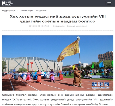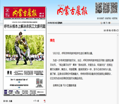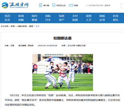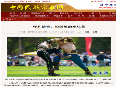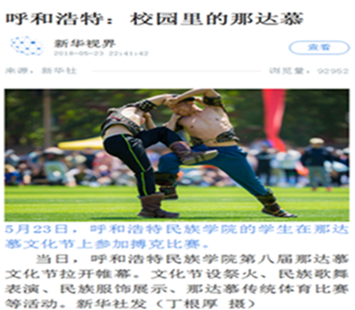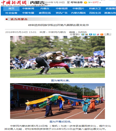 经学校党委宣传部的大力推广和团委、网络中心、保卫处、后勤管理处、体育系等部门的协助,本次那达慕文化节的媒体宣传工作实现了历史性突破。截止到5月28日,共有30家新闻媒体进行了专题报道,媒体覆盖广度和宣传报道力度是建校以来之最。其中,《中国日报》(英文名称《China Daily》,全球发行,期均90余万份)在显要位置以图片新闻报道;《中国青年报》《内蒙古日报》(蒙古语、汉语版)《呼和浩特日报》《北方新报》《呼和浩特晚报》《内蒙古晨报》7家报纸媒体进行了头版报道,《内蒙古日报》(蒙古语版)整版报道;内蒙古卫视2个电视频道,新华社、人民网、光明网、新华网、中国新闻网等11家网站,中央人民广播电台、中国蒙古语广播电台、内蒙古广播电台蒙古语频道、呼和浩特新闻广播等3家电台,影像内蒙古、北疆大学生、内蒙古客户端、内蒙古日报等4家主流微信公众号进了报道;新浪网、网易网、中国民族宗教网、《山西日报》等仅百余网站、媒体进行了转载报道。