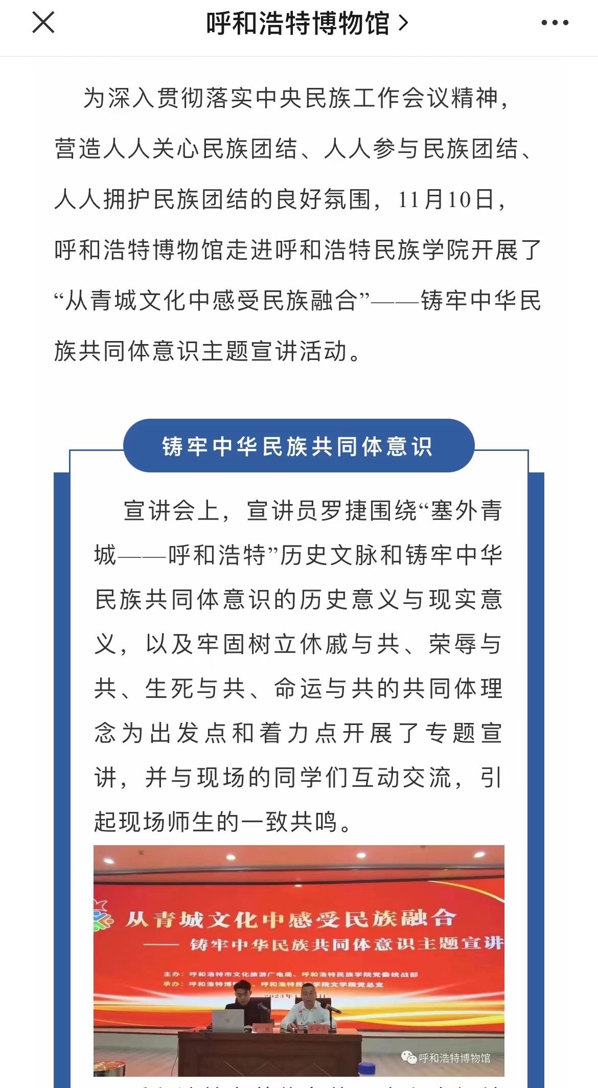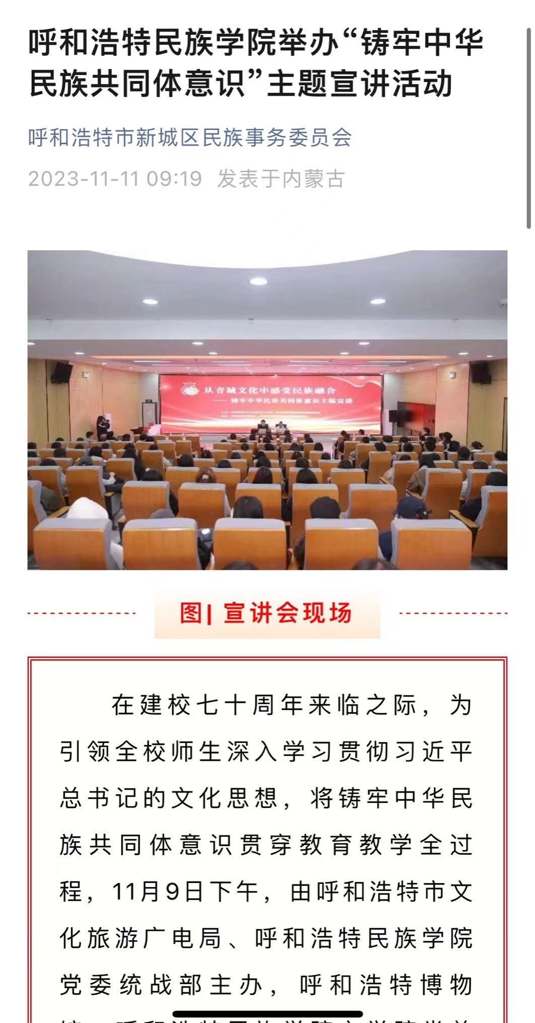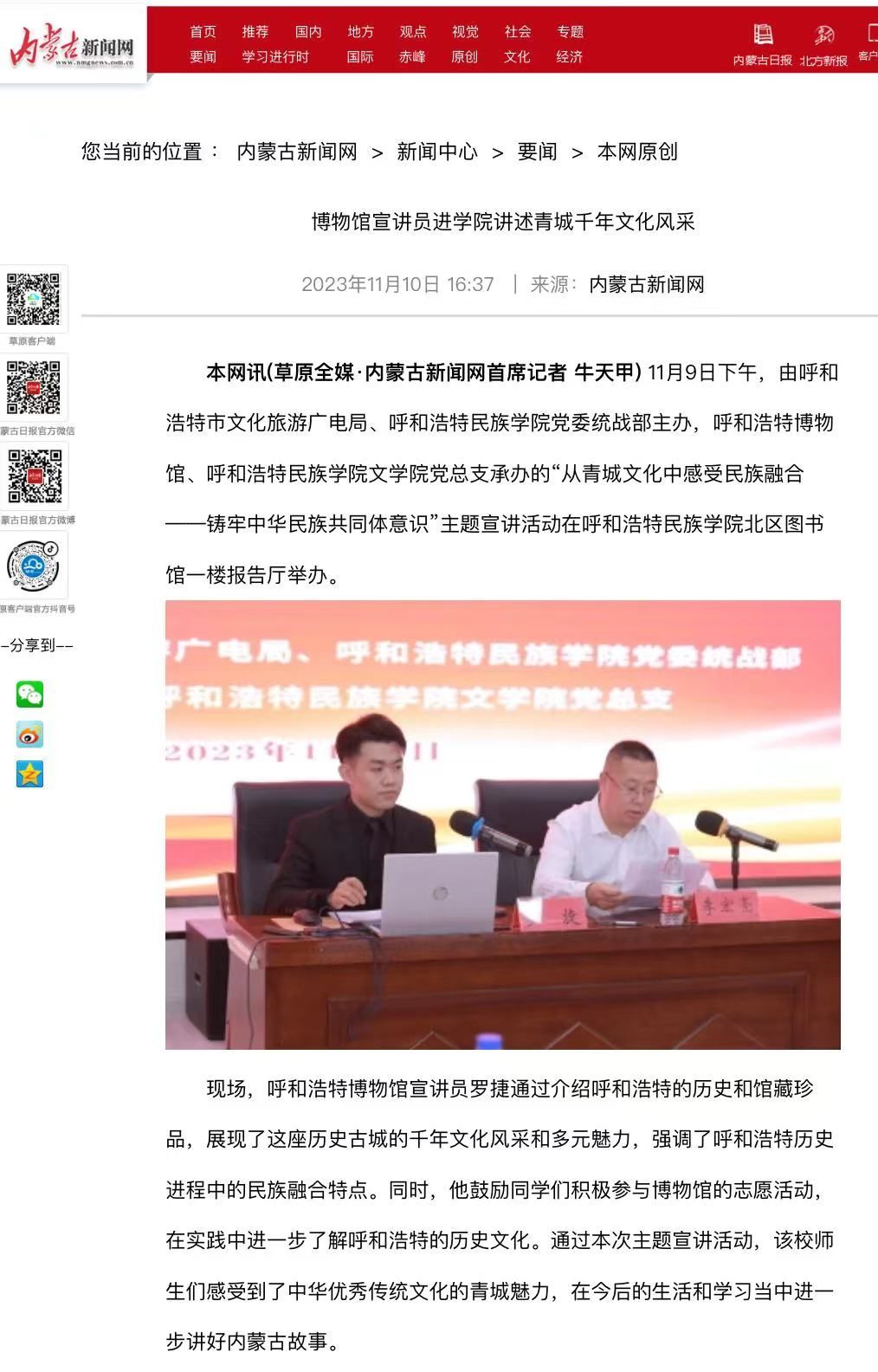 11月9日下午,由呼和浩特市文化旅游广电局、YABO鸭脖党委统战部主办,呼和浩特博物馆、YABO鸭脖文学院党总支承办的主题宣讲活动在北区图书馆一楼报告厅举办。活动受到社会各界的广泛关注和大力宣传。截至目前,共有中新网、内蒙古新闻网和内蒙古党委统战部官微、呼和浩特博物馆官微、呼和浩特新城区民族事务委员会官微等6家校外媒体对本次活动进行了宣传报道。