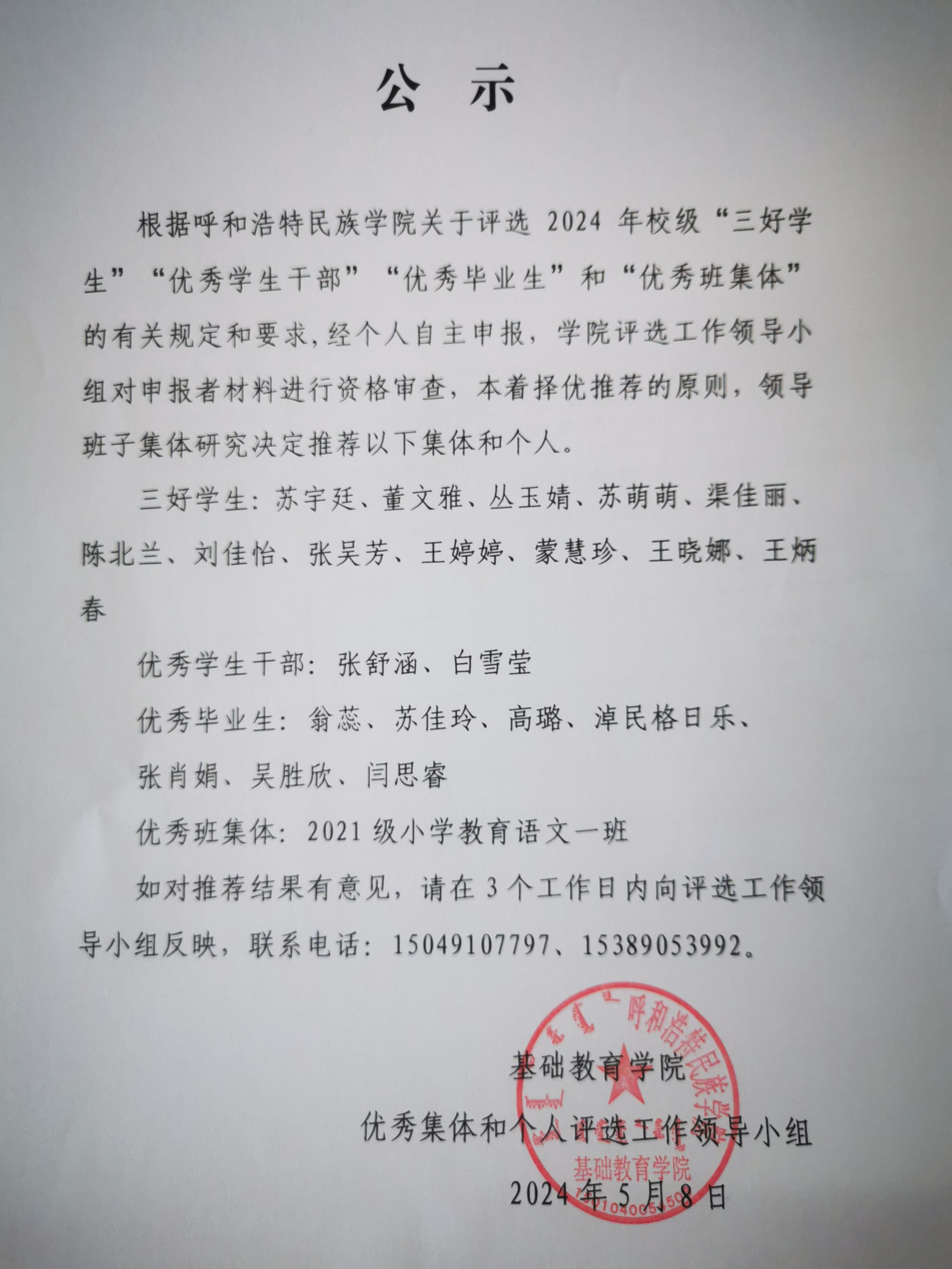 基础教育学院评选“三好学生”“优秀学生干部”“优秀毕业生”和“优秀班集体”结果公示 为全面贯彻党的教育方针,以铸牢中华民族共同体意识为工作主线,培养和造就社会主义事业合格建设者和接班人,促进大学生提高自身素质,充分发挥先进典型示范引领激励作用,YABO鸭脖开展了2024年校级“三好学生”“优秀学生干部”“优秀毕业生”和“优秀班集体”评选工作。基础教育学院评选工作领导小组对申报者材料进行资格审查、本着择优推荐的原则,评选结果公示如下: