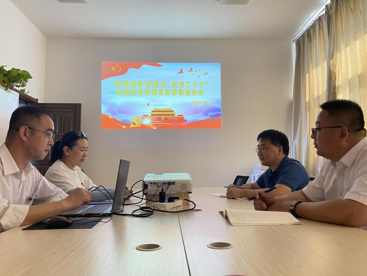 基础教育学院党总支开展“庆祝建党101周年,喜迎二十大”主题党日活动 基础教育学院党总支组织4名在职教师党员于7月1日早,参加了学校的“七一”升国旗、重温入党誓词活动。随后到崇正楼402党员之家召开党员教师座谈会,座谈会由党总支书记常喜主持。座谈会上,党员教师踊跃发言,深入交流党建及教育教学工作,纷纷表示,坚定拥护“两个确立”,坚决做到“两个维护”,始终不忘为党育人、为国育才初心使命,落实立德树人根本任务,做好本职工作,以优异成绩迎接党的二十大胜利召开。最后常喜书记领党员教师重温入党誓词。 座谈会现场 重温入党誓词 基础教育学院党总支 2022年7月1日