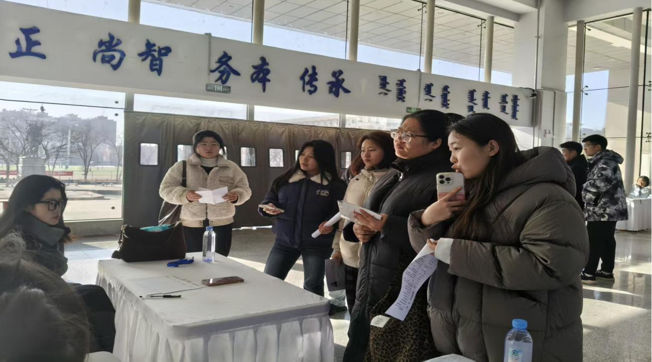 12月6日,教育学院主办的“育见未来 职引新程”2026届教育人才专场招聘会在都林楼二楼大厅顺利举行,本次招聘会由内蒙古新质联人力资源服务有限公司承办。教育学院党总支书记威娜,院长哈达、副院长朱乌英嘎、团总支书记常志君等学院领导及招聘方代表出席了活动。