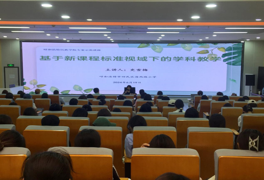 为进一步促进学科专业高质量发展,增强服务地方和行业的能力,根据教育教学需要,6月19日上午,基础教育学院开展本学期“中小学名师进校园”系列活动,特邀呼和浩特市回民区海西路小学校长史雪梅举办专题讲座,帮助学院学生深入了解小学教育课程标准,有效提升师范生核心素养和教育教学技能,推动卓越教师人才培养,提高高素质应用型人才培养质量。讲座由学院教研室主任王玉霞老师主持,副院长额尔敦其其格出席,2021级小学教育专业全体学生参加。