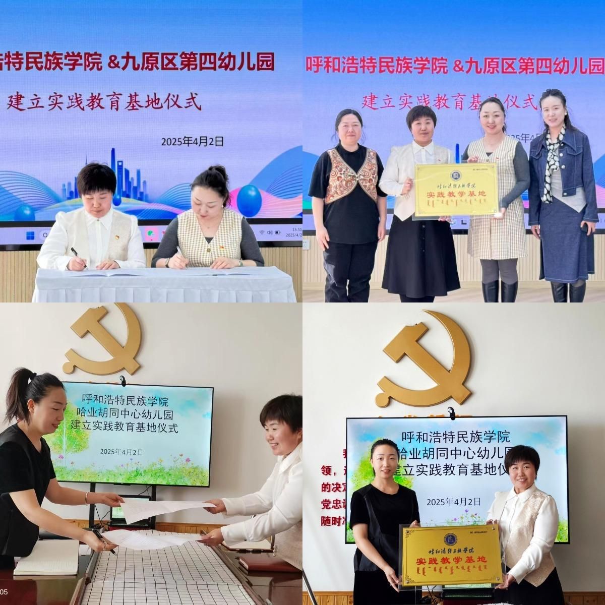 首先,教育学院副院长朱乌英嘎带队分别来到包头市九原区哈业胡同中心幼儿园和九原区第四幼儿园,受到了园方领导班子及全体教职工的热烈欢迎。双方举行了隆重的实践教学基地签约暨挂牌仪式。签约仪式上,哈业胡同中心幼儿园园长姜波与九原区第四幼儿园园长诺敏,各自介绍了幼儿园的办园理念、师资力量、教学特色以及发展规划,强调了实践教学对学前教育专业学生成长的重要性,期待与学院共同探索人才培养新模式,为学前教育领域输送更多优秀人才。教育学院副院长朱乌英嘎也介绍了学院学前教育专业的课程设置、人才培养目标以及近年来取得的教学成果,希望借助实践教学基地这一平台,加强双方在教学、科研、师资培训等方面的全方位合作,实现资源共享、优势互补。随后,双方代表共同签署了合作协议,并为实践教学基地揭牌。