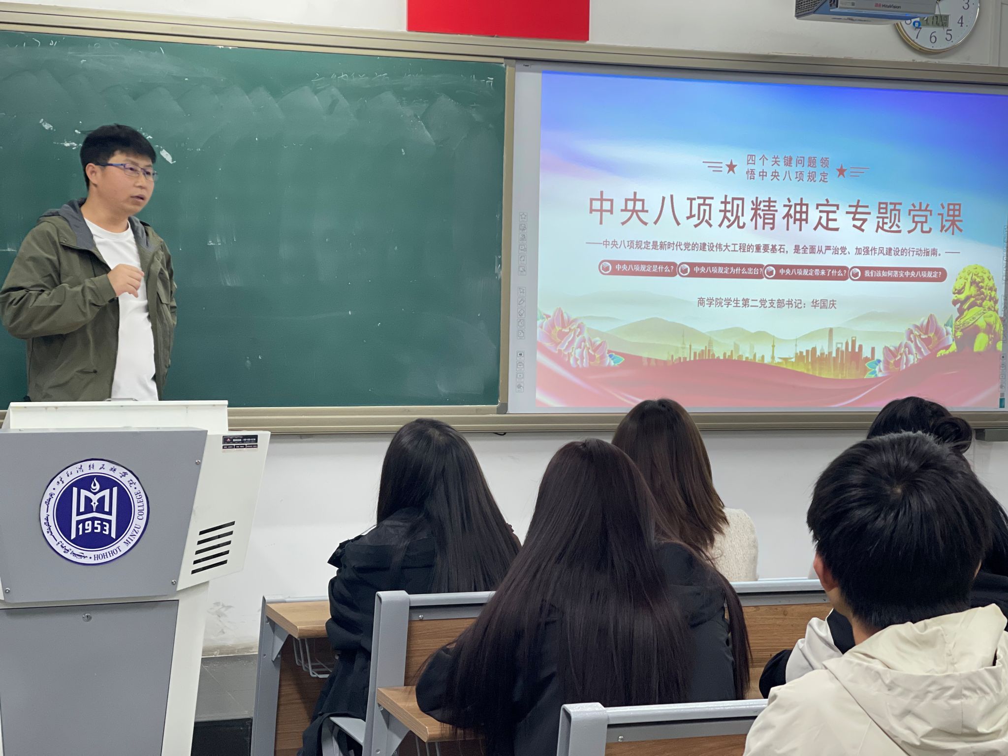 为深化学习领会中央八项规定精神,切实强化支部党员政治觉悟和纪律观念,4月18日,商学院学生第二党支部于尚智楼202教室联合举办专题党课活动。本次活动以"深化贯彻中央八项规定精神专题教育"为核心主题,全体支部党员共同参与,由第二党支部书记华国庆老师进行专题授课。