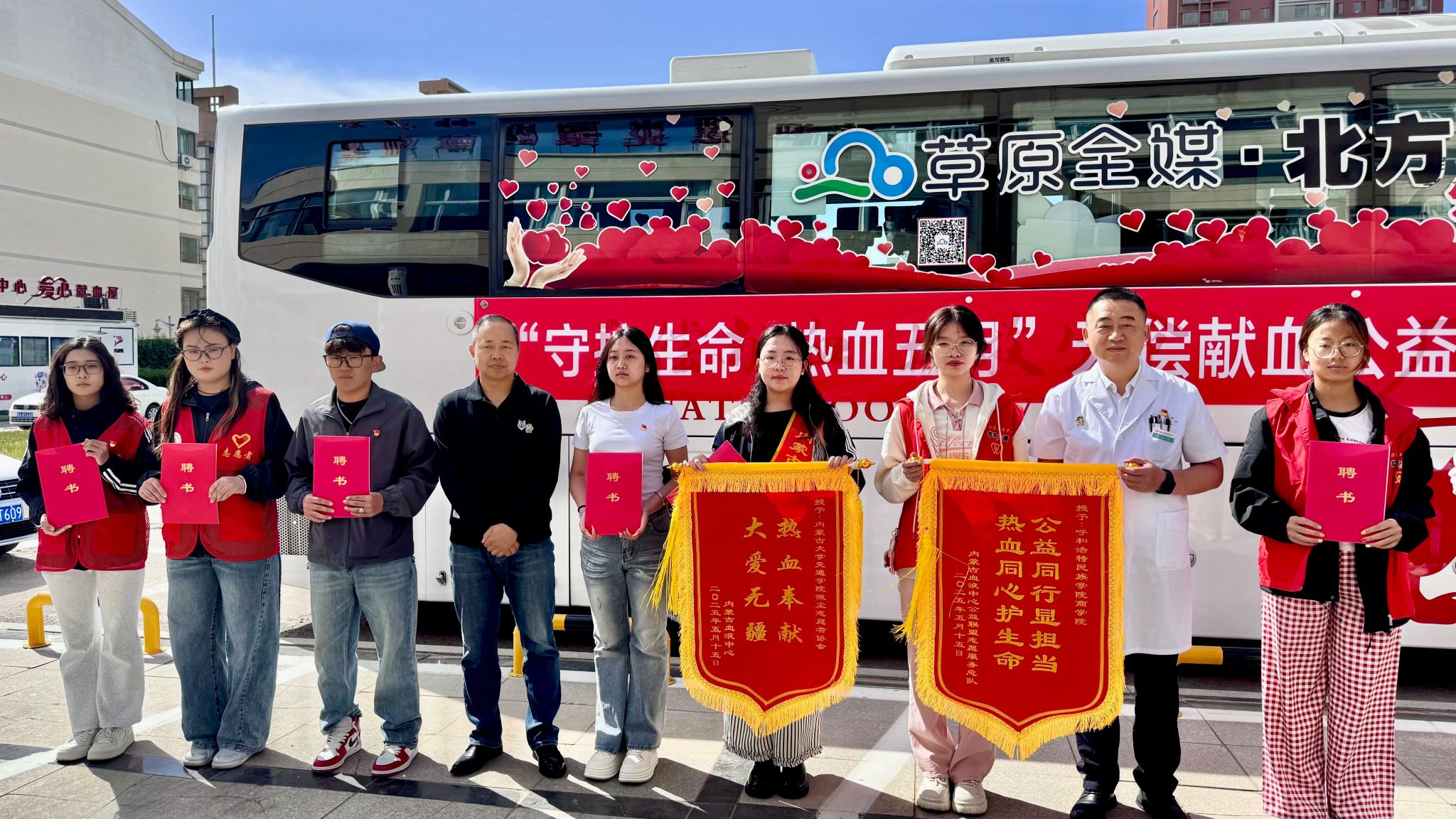 表彰环节坚持"注重实绩、简化程序"要求,内蒙古自治区血液中心主任张硕为 2024 年度 “优秀志愿者” 颁发荣誉证书,内蒙古新闻网传媒有限责任公司《北方新报》副总编辑刘霄则向商学院志愿者代表颁发聘书并赠予锦旗,高度肯定其为无偿献血事业发展所付出的努力与做出的积极贡献。整个表彰过程控制在15分钟内,避免铺陈仪式。