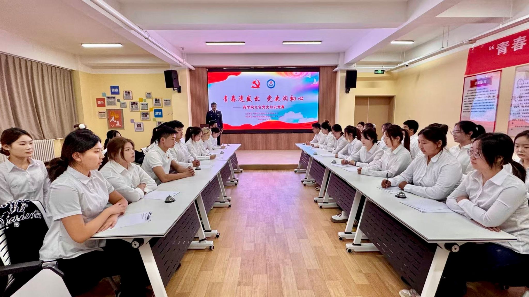 为切实推进党史学习教育工作,有效引导广大青年学子厚植爱党爱国情怀,积极汲取奋进力量,11月20日,由商学院党总支主办、学生党支部承办的“青春逢盛世,党史润初心”主题党史知识竞赛决赛于学校团委青春驿站圆满举行。本次党史知识竞赛严格有序地划分为初赛和决赛两个阶段,竞赛内容全面且精准地涵盖了党的百年光辉历程、重大方针政策、经典革命故事等关键要点,兼具较高的知识性与生动的趣味性。