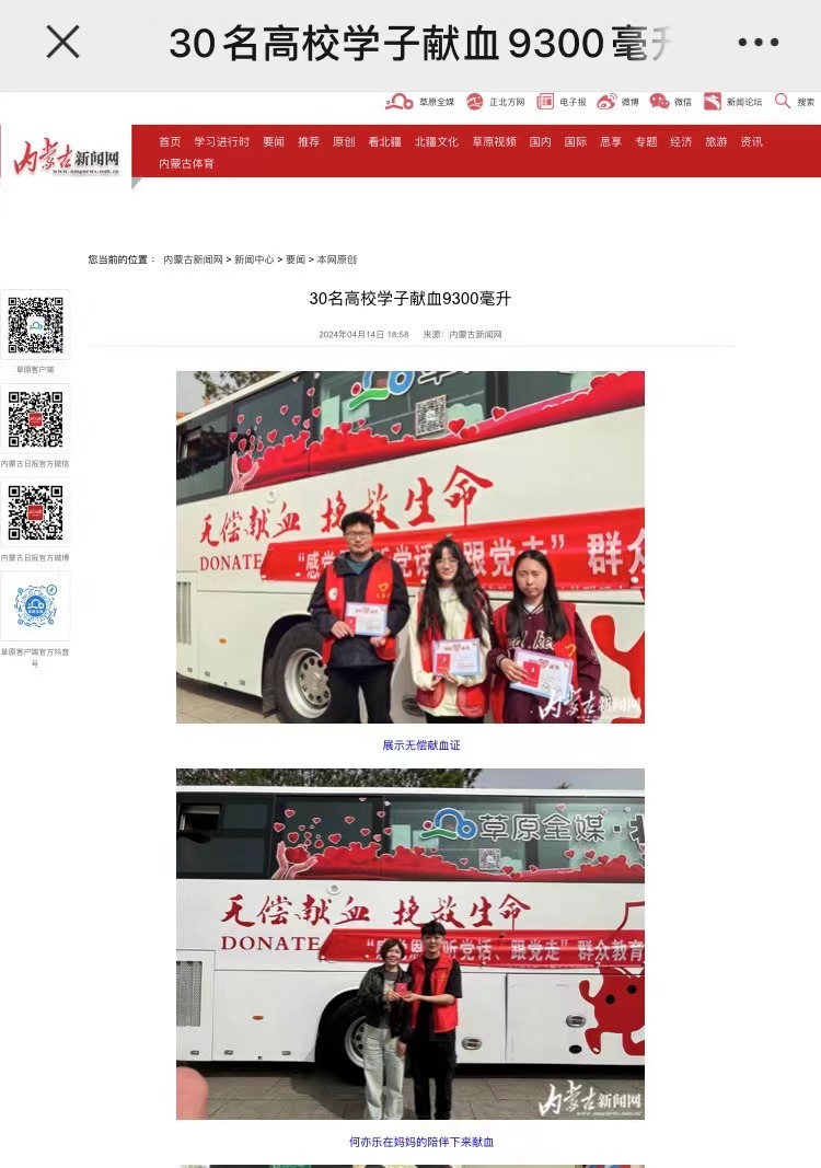 4月14日、YABO鸭脖经济管理学院内蒙古工业大学电力学院共计50人走进大召广场参加无偿献血活动,活动当天共30人成功献血9300毫升