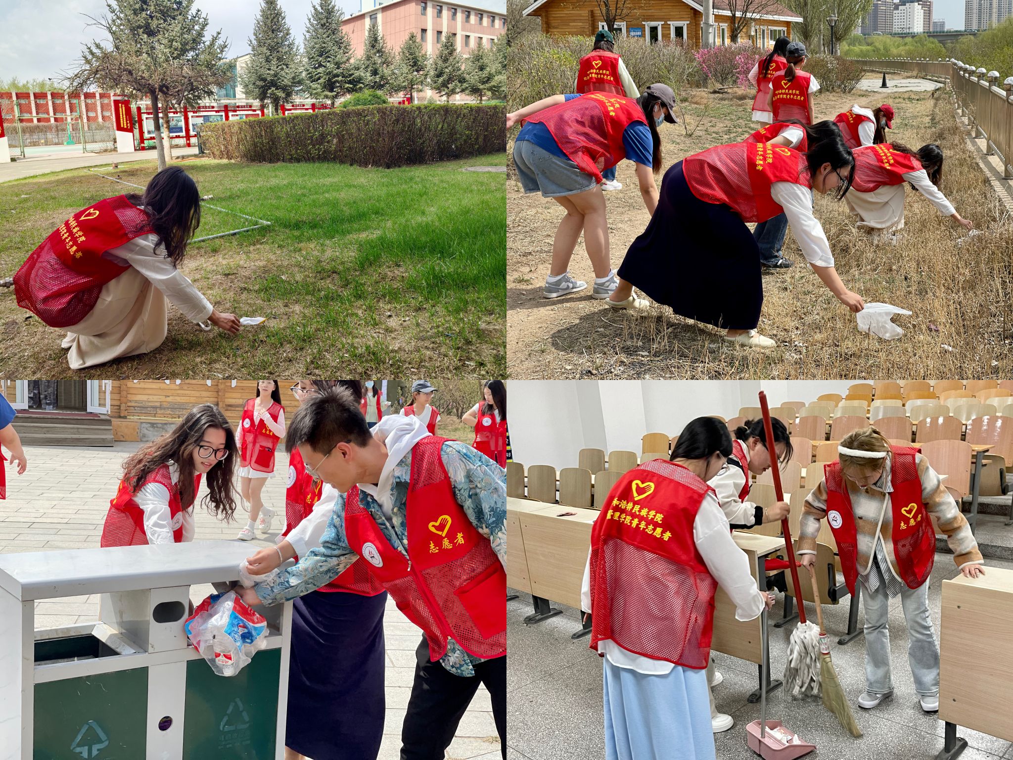 我院青年志愿者对校园内部分区域、教室、校园周边公园进行了打扫以及清理。志愿者们不怕脏不怕累积极清扫杂草、落叶、枯枝,处理道路角落的烟头和草坪上的白色垃圾。