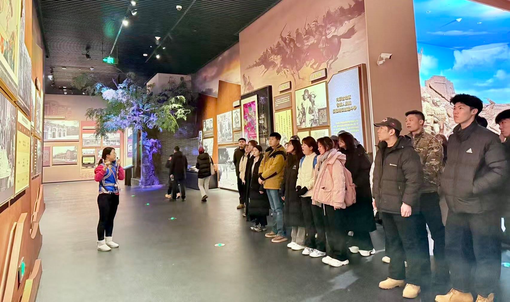 活动初始,在博物院讲解员的专业引导下,同学们有条不紊地参观了博物院的“草原烽火(内蒙古现代革命斗争史陈列)”展厅。该展厅生动展现了1919年五四运动至1949年新中国成立期间,内蒙古各族人民波澜壮阔的反侵略反封建斗争及革命发展进程。