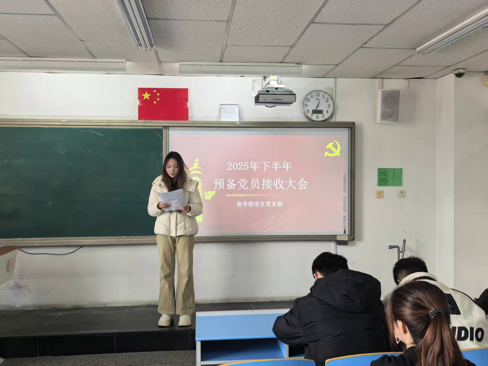 为进一步强化党组织建设,为党组织注入新鲜力量,2025年12月17日,商学院学生党支部于尚智楼312教室召开2025年下半年预备党员接收大会。学院学生第一、第二党支部书记樊寒伟、华国庆,组织委员边雨桐、曹国利出席此次会议,全体学生党员以线上线下相结合的方式全部参与会议。