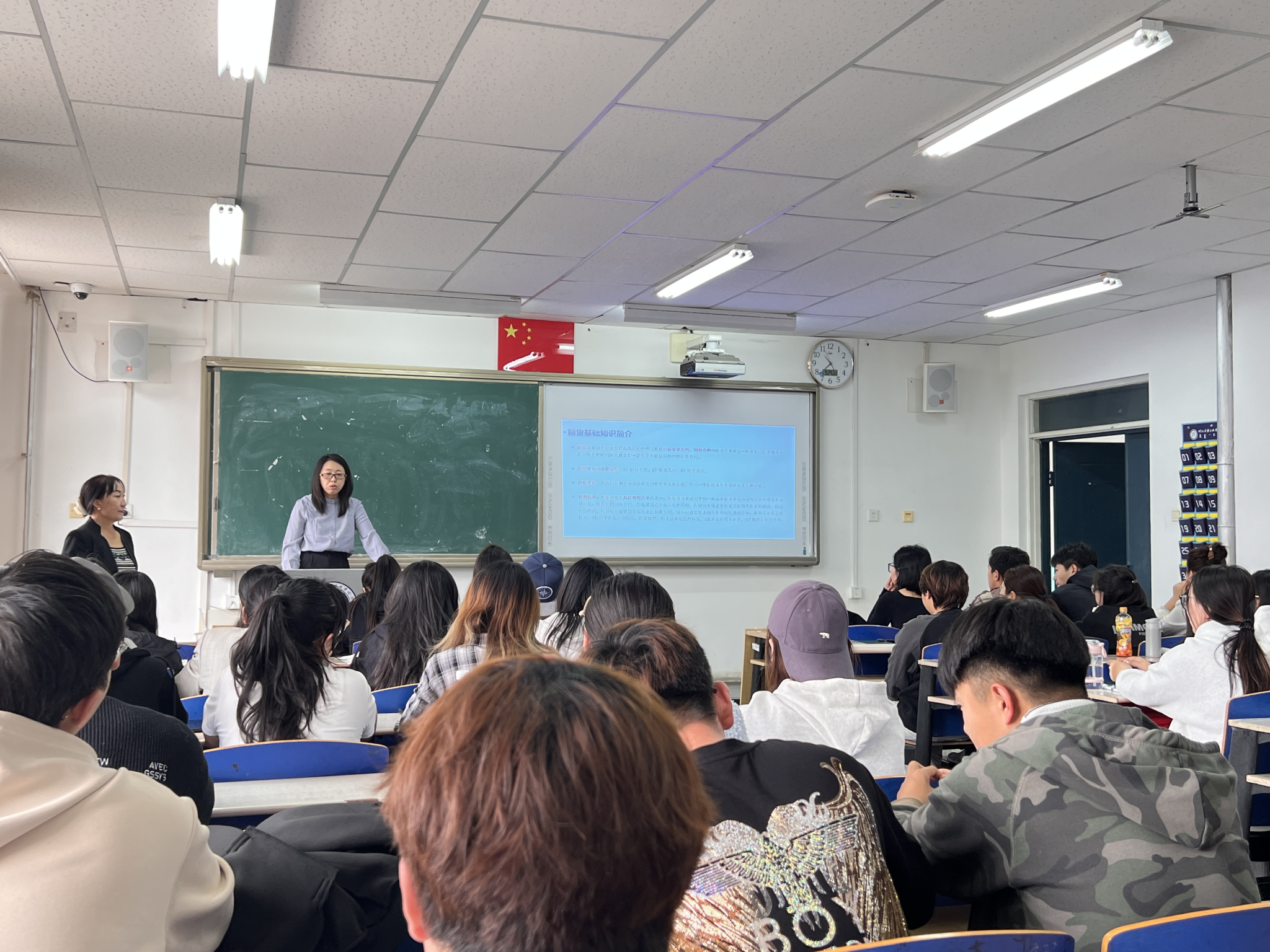 讲座由恒泰期货内蒙古分公司总经理助理张婷婷讲师主讲,经济管理学院布音其其格老师组织学生听讲。