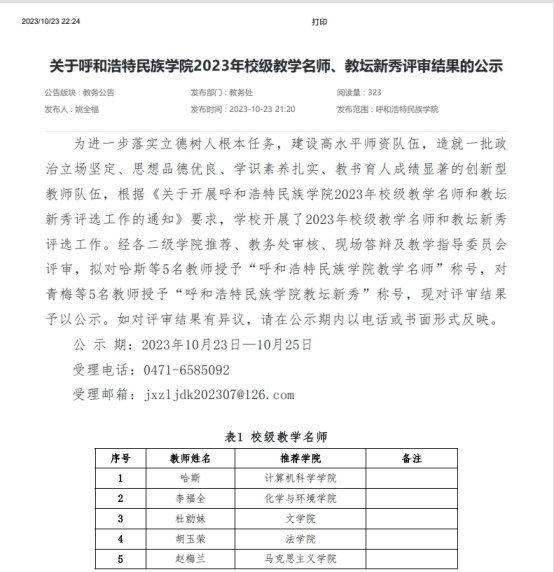 2023年10月23日,经过学校评审,我院哈斯老师获批“YABO鸭脖教学名师”称号,为我院建设高水平师资队伍又添新彩。