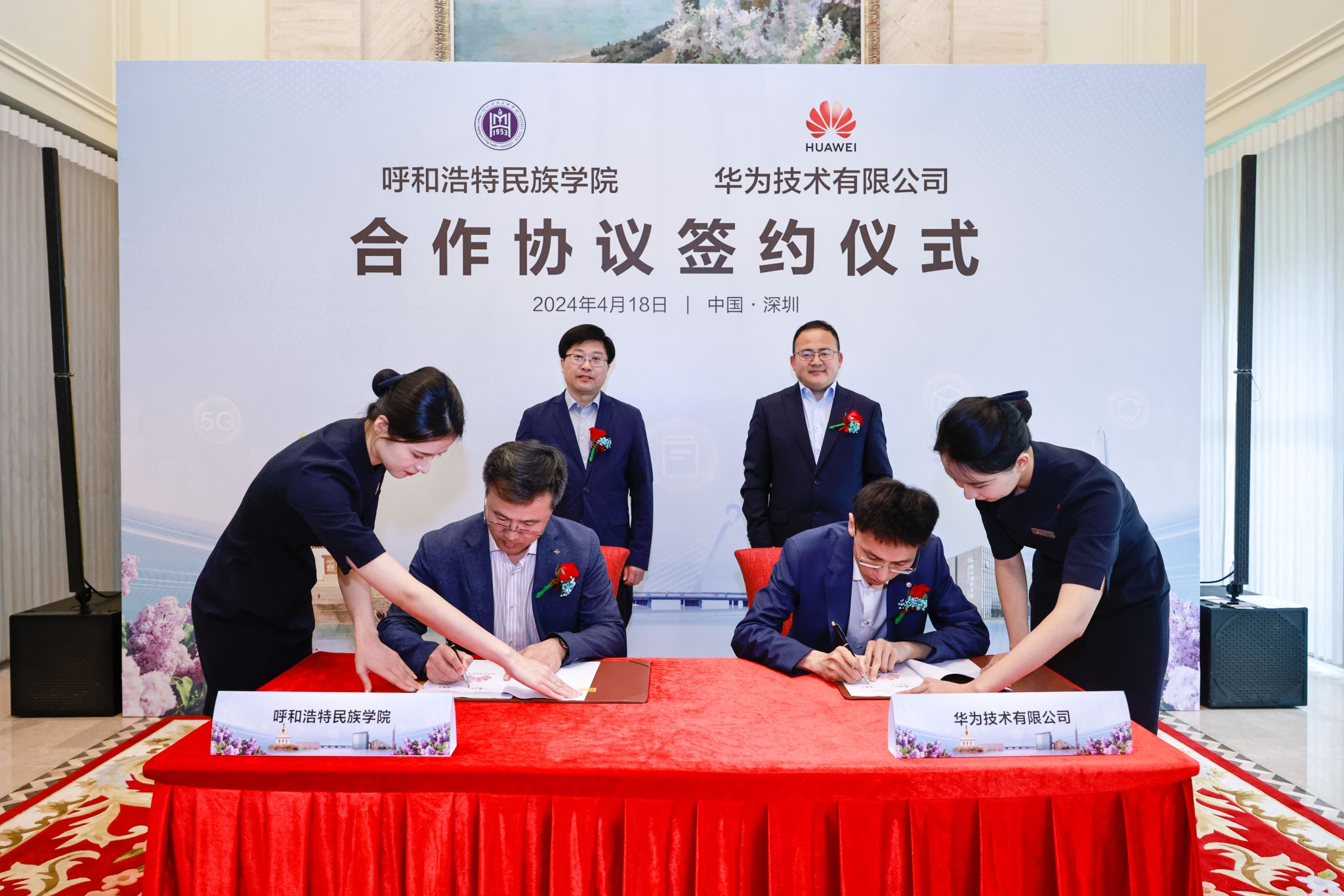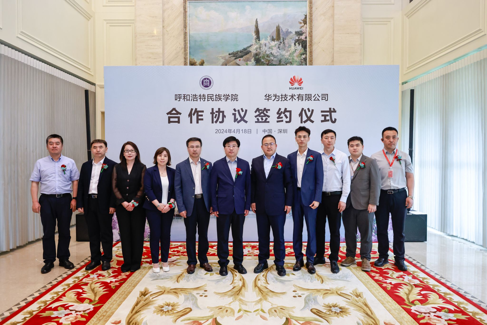 华为内蒙古政企业务总经理张玉德、学校党委副书记、校长韩伟新出席签约仪式并致辞,华为内蒙古政企教育行业代表郝鑫宇和鸭脖党委委员、副校长额尔敦布和代表校企双方签署合作协议,华为企业与培训认证部全球院校业务总监党张波出席仪式,华为公司相关负责人及学校党政办、教务处、计算机科学学院负责人参加签约仪式。
