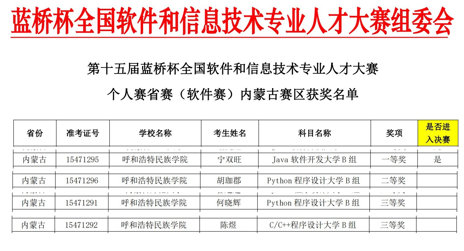 本届大赛分为个人赛和团队赛两大项,鸭脖选手参加了软件类个人赛,其中计算机科学学院的宁双旺同学荣获Java软件开发组一等奖,胡珈郡同学荣获Python程序设计组二等奖,陈煜同学荣获C/C++程序设计组三等奖,何晓辉同学荣获Python程序设计组三等奖的佳绩。宁双旺同学将代表学校参加第十五届“蓝桥杯”全国软件和信息技术专业人才大赛——个人赛国赛(软件类)。