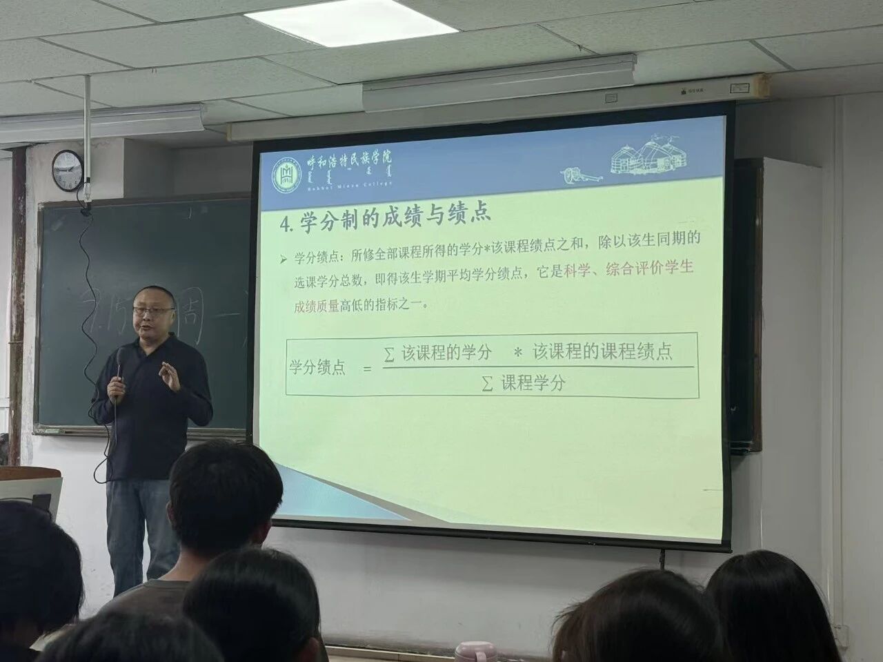 为帮助新生全面了解大学学分制度,适应新环境,合理规划大学生活,2025年9月15日下午,在尚智楼214教室举办新生入学教育讲座,由学院副院长色登丹巴担任主讲。