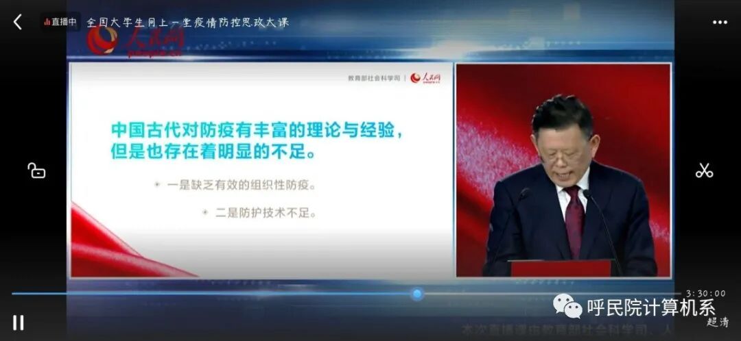 3月9日下午,一堂全国大学生共同参与的思政课开讲了。计算机科学与信息工程学院提前筹划,积极组织,按时观看了教育部社科司与人民网联合组织的“全国大学生同上一堂疫情防控思政大课”直播,学院从大一到大四共计700余名学生通过网络上了堂既生动感人又充满责任担当的思政课