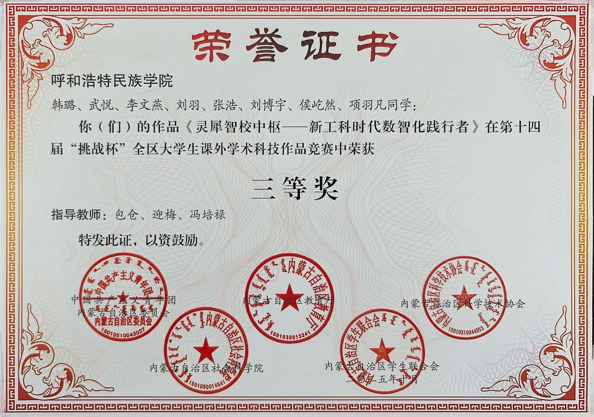 在决赛中,我院参赛团队凭借扎实的学术功底与创新实践能力,从全区高校众多项目中脱颖而出,其中《草原书韵——AI赋能红色之旅新篇章》项目荣获二等奖;《灵犀智校中枢——新工科时代数智化践行者》、《星河智轨——云端协同的AI物流决策系统》《羽翼识踪》《蜂巢智巡-UWB厘米级定位的图书馆多机协同巡检系统》等4个项目荣获三等奖。获奖项目涉及人工智能算法优化、新能源材料研发等多个前沿领域,聚焦社会需求与技术突破,既体现了对学科理论的深度思考,又展现了将科研成果转化为实际应用的能力。