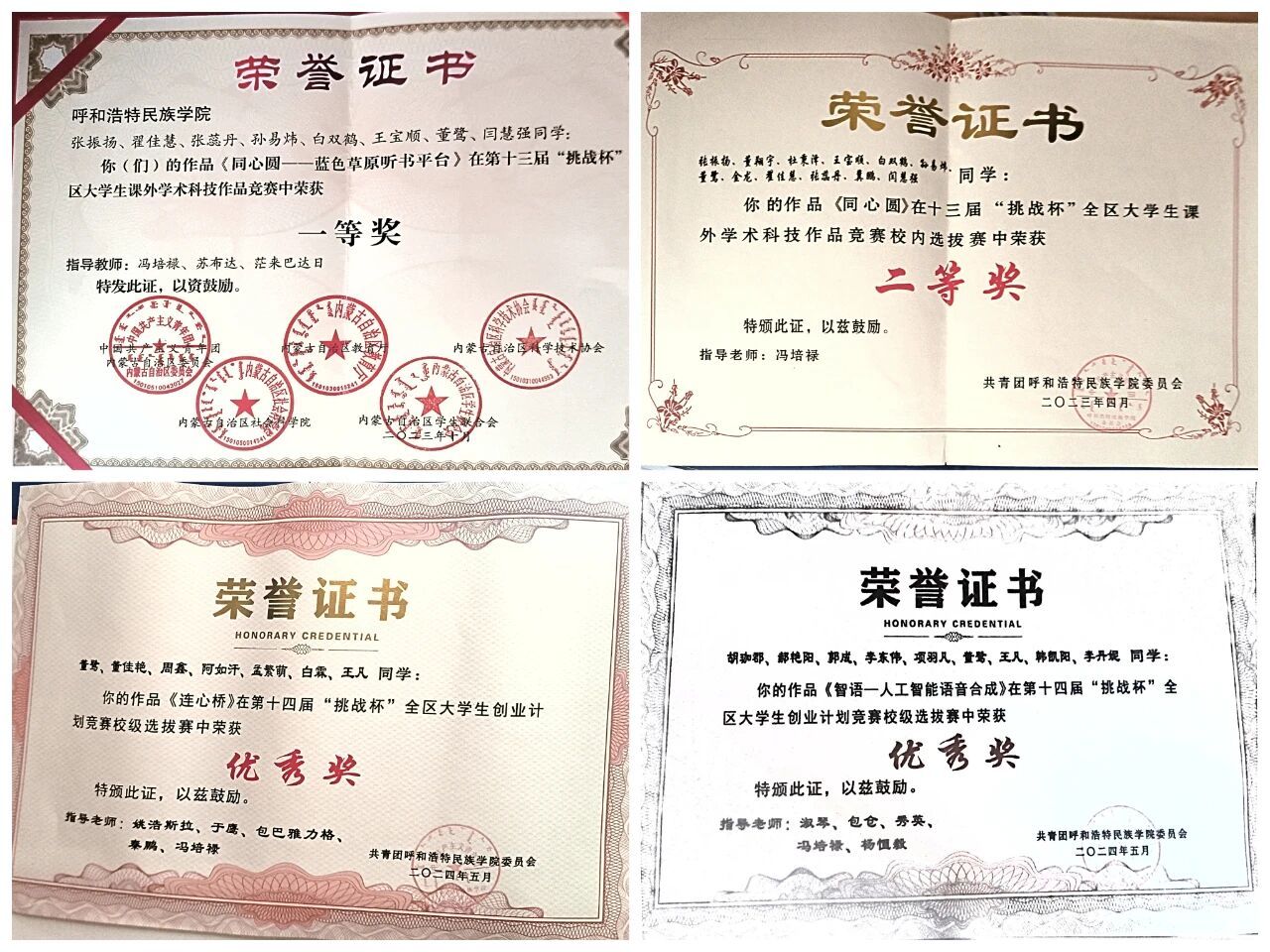 这份荣誉不仅是对我努力的肯定,更承载着老师们的期望。乌兰夫先生的事迹一直激励着我,他为民族解放和国家建设无私奉献,让我明白个人成长要与家国命运相连。在学习的道路上,我有过迷茫和挫折,是老师的悉心指导,同学的热心帮助,让我坚定前行。我始终保持对知识的渴望,勤奋钻研,积极参加各类比赛,努力提升自己。