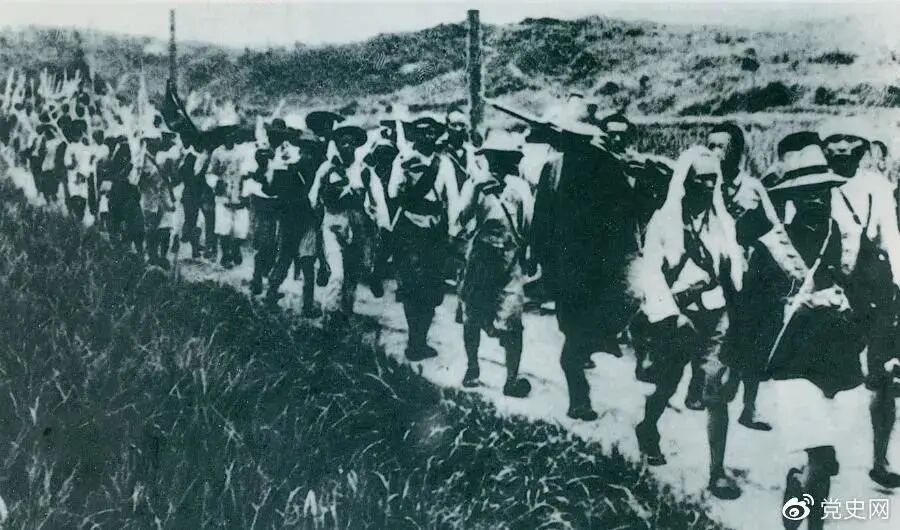 1931年5月16日至31日,红一方面军在毛泽东、朱德指挥下,连续打了5个胜仗,歼敌3万余人,缴枪2万余支,打退了国民党军队的第二次“围剿”。图为行军中的红军。