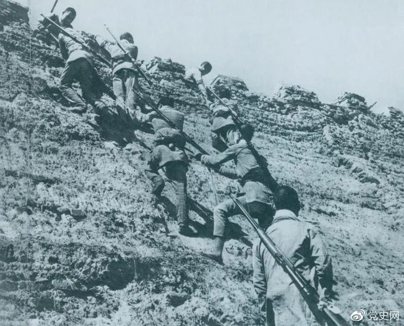 1945年6月25日,八路军冀中部队攻克河北献县。图为部队奋勇攀登城墙。