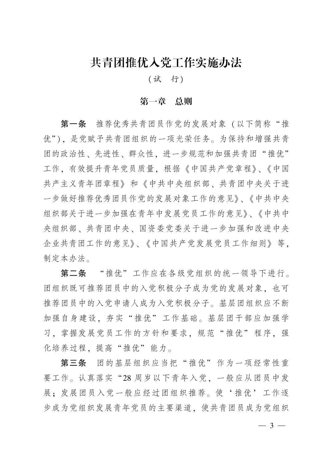 第一条 推荐优秀共青团员作党的发展对象(以下简称“推优”),是党赋予共青团组织的一项光荣任务。为保持和增强共青团的政治性、先进性、群众性,进一步规范和加强共青团“推优”工作,有效提升青年党员质量,根据《中国共产党章程》、《中国共产主义青年团章程》和《中共中央组织部、共青团中央关于进一步做好推荐优秀团员作党的发展对象工作的意见》、《中共中央组织部关于进一步加强在青年中发展党员工作的意见》、《中共中央组织部、共青团中央、国资委党委关于进一步加强和改进中央企业共青团工作的意见》、《中国共产党发展党员工作细则》等,制定本办法。