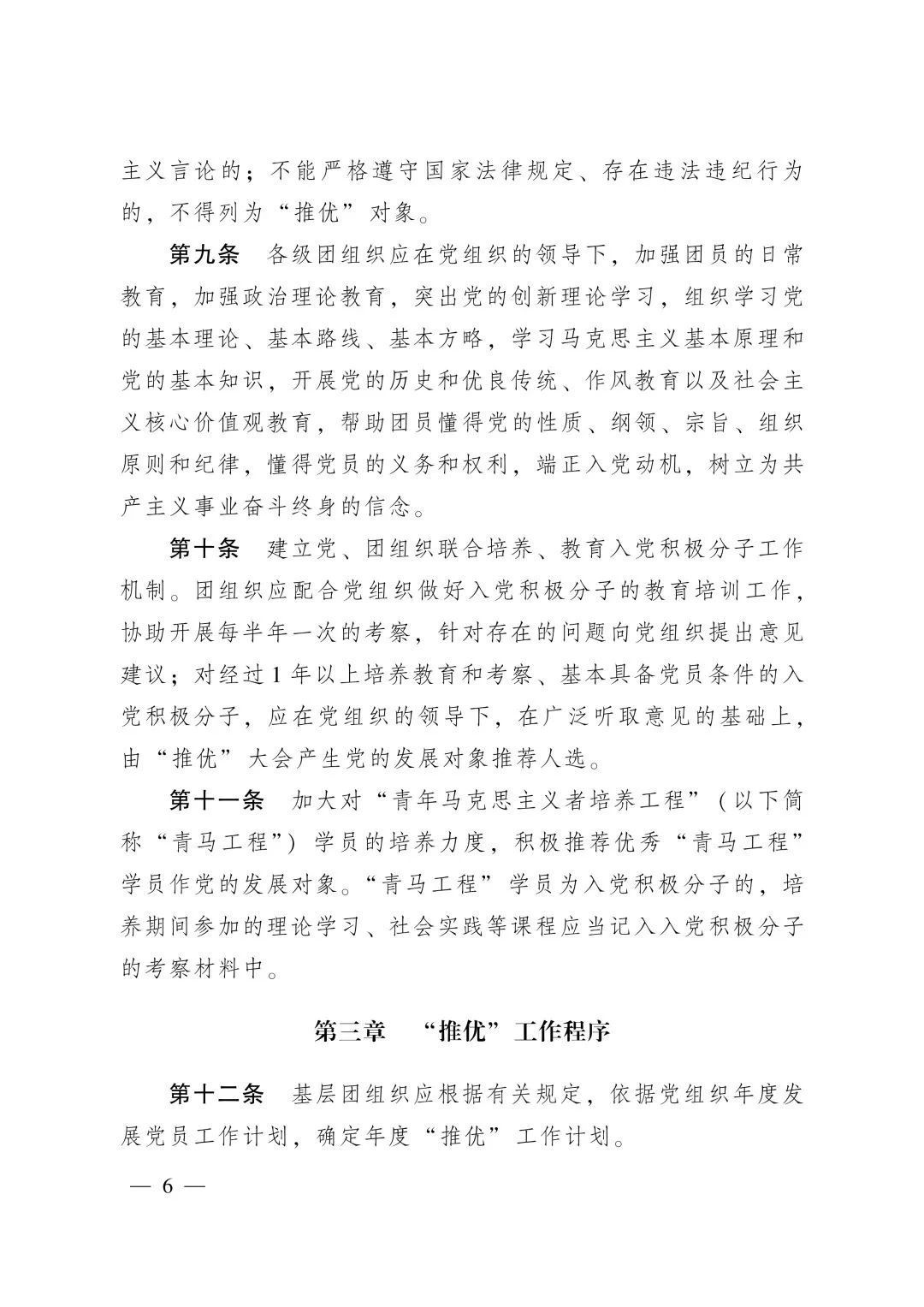 第十条 建立党、团组织联合培养、教育入党积极分子工作机制。团组织应配合党组织做好入党积极分子的教育培训工作,协助开展每半年一次的考察,针对存在的问题向党组织提出意见建议;对经过1年以上培养教育和考察、基本具备党员条件的入党积极分子,应在党组织的领导下,在广泛听取意见的基础上,由“推优”大会产生党的发展对象推荐人选。