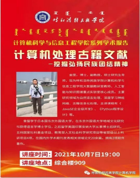 2021年10月7日19时,计算机学院金罡老师的讲座在综合楼909顺利召开。其中共有55位2021级学生出席本次讲座。讲座通过讲解语言学、语言信息处理、自然语言处理等概念进一步介绍了人工智能中人类语言与计算机相结合的一些技术,如语音识别、机器翻译、语言自动生成等,最后演示了用计算机从古籍文献中挖掘对现代社会有启发意义的内容的技术。