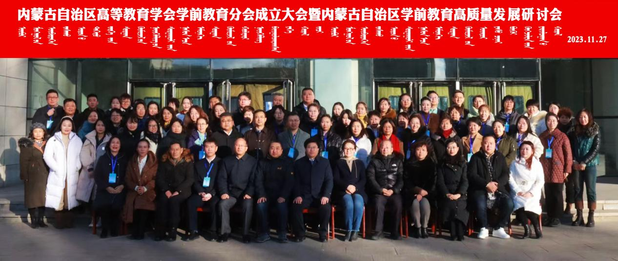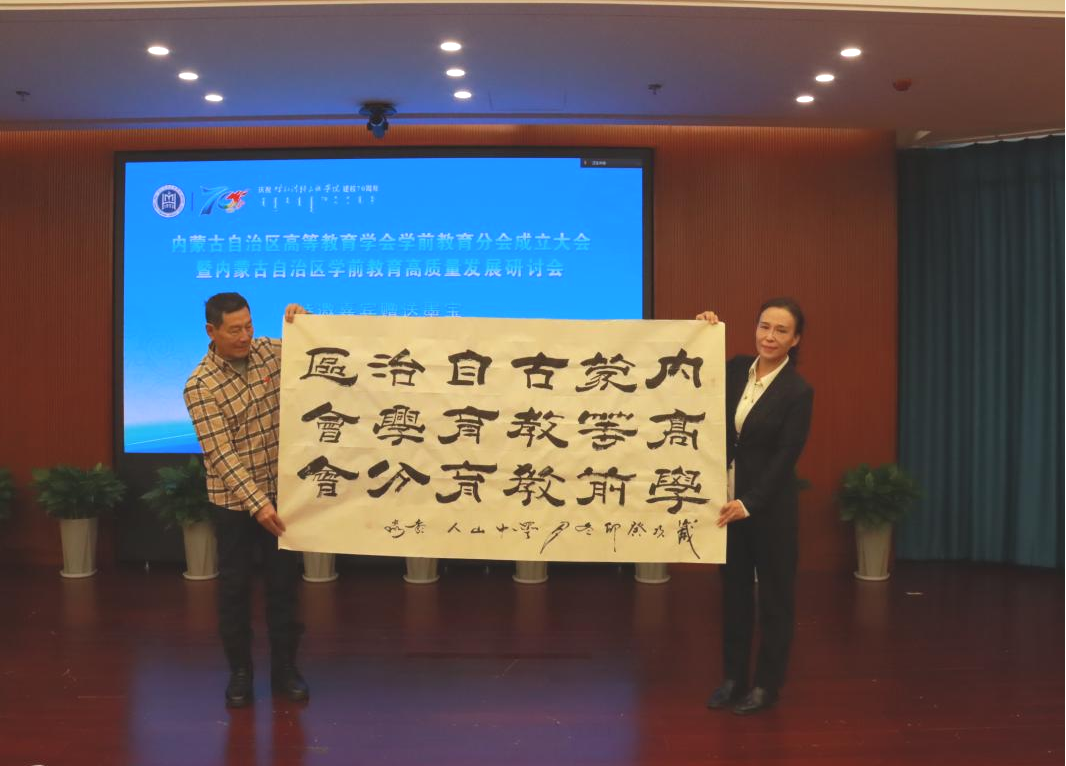 韩伟新和高教学会副秘书长、内蒙古工业大学马克思主义学院党委书记王文华共同为学前教育分会揭牌。中国书画协会副主席彭淼赠送墨宝,学前教育学院党总支书记娜仁其木格接受馈赠。学前教育学院副院长朱乌英嘎宣读《学前教育分会工作规程》,学前教育学院副院长其其格介绍学前教育分会筹备情况。经选举,推选其其格为学前教育分会理事长,内蒙古师范大学教育学院原院长米俊魁为常务副理事长,朱乌英嘎为秘书长。
