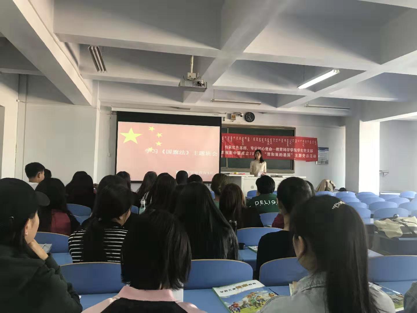 中华人民共和国成立70周年之际,鸭脖为了维护国旗的尊严,进一步在我院全体学生中普及国旗法相关知识,提高大学生对国旗的认识,增强大学生的国家观念,发扬爱国主义精神。我院开展学习《中华人民共和国国旗法》专题教育活动,2019年9月25日,我院应学校要求开展了以“学习和践行《国旗法》,做新时代的爱国者”为主题的活动。