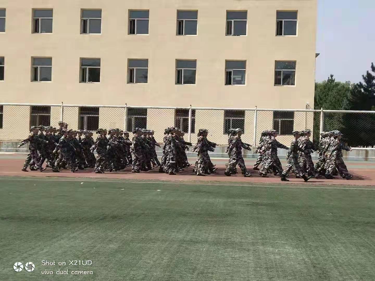 在军训场上同学们,风华正茂;逞飒爽英姿,风采巾帼。蓝天白云,晴空万里代替了习习秋风,烈火骄阳拷打着我们的心。站军姿,练转身,走正步, 练队形。无数次重复的口令让教官的嗓音沙哑,无数回对动作的纠正也曾让教官眉头紧皱,一遍遍的动作示范让教官的额头布满汗滴。但是,沙哑的噪音掩盖不了教官的严谨,微皱的眉头黯淡不了教官的关心,布满额头的汗滴冲淡不了教官的尽职。
