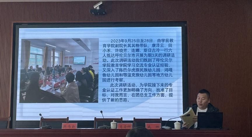 学前教育学院副院长其其格从专业认证的准备工作、调研反思、改进要点三个方面进行汇报。强调落实落地“学生中心、产出导向、持续改进”的理念与逻辑,提出三个持续改进:培养目标的持续改进、毕业要求的持续改进、课程设置的持续改进,表示专业认证是一场专业建设、课程建设的系统升级。斯日古冷老师重点提到了呼伦贝尔学院开展的“第二课堂”,强调开展第二课堂对培养全面人才、增强学生发展内驱力等方面的重要意义,提出构建学院“第二课堂”队伍体系,完善培训体系,开展系列特色活动,建立健全评优制度,提升学生“第二课堂”组织度、认知度、参与度与知名度。