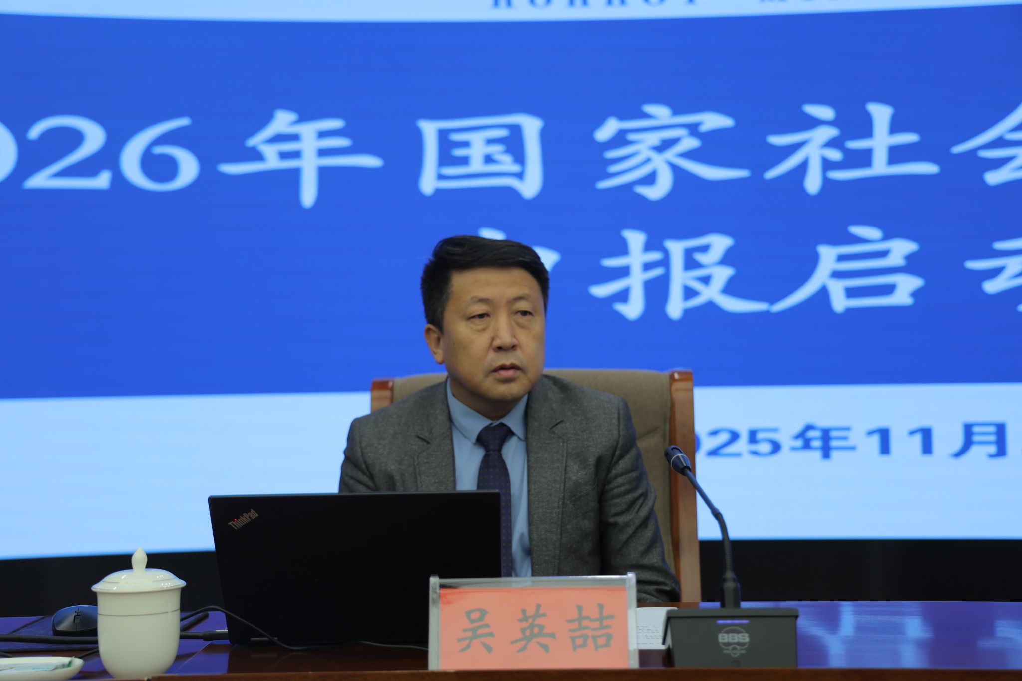 11月21日上午,鸭脖在综合楼12楼会议室召开2026年度国家社会科学基金项目申报启动会。会议特邀教育部“长江学者奖励计划”特聘教授、内蒙古大学吴英喆教授作专题辅导。校党委委员、副校长额尔敦布和主持会议,副高以上职称人员、具有博士学位的教师以及科研处(社科处)全体人员参加了会议。