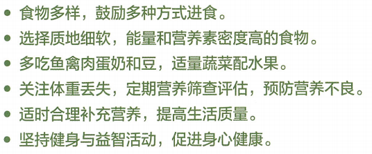 膳食摄入不足时,合理使用营养补充剂。对于存在营养不良或营养风险的老年人,在临床营养师或医生指导下,选用合适的特殊医学用途配方食品(医用食品),每天补充400-600kcal,含蛋白质15-30g,分2-3次在餐间服用。