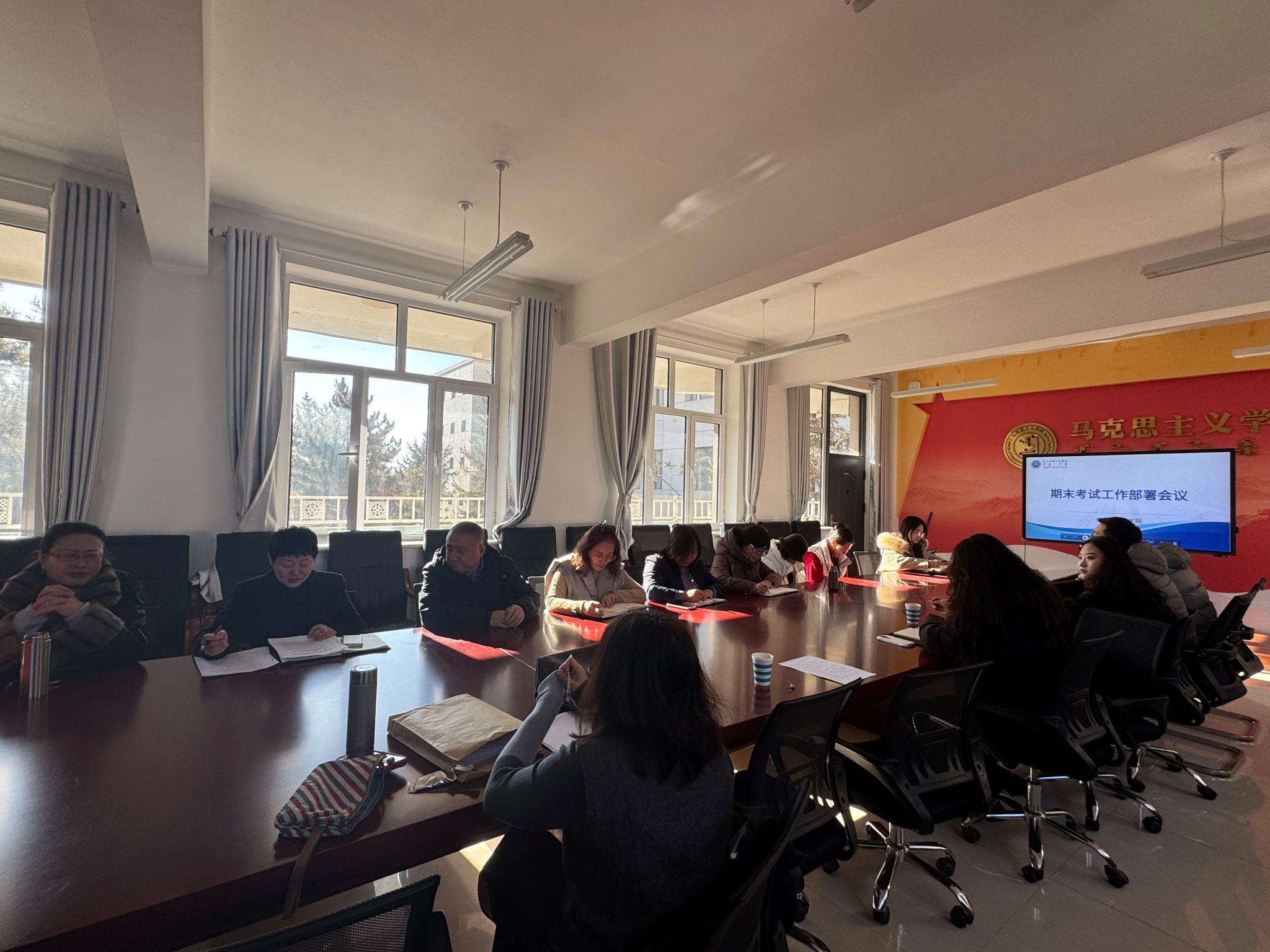 为扎实做好期末考试组织工作,保障考试环节规范有序、公平公正,12月25日,马克思主义学院召开期末工作部署会议,学院领导班子成员、各教研室主任及全体任课教师参会,会议就期末试卷命题、监考、阅卷、试卷装订归档等关键工作进行全面安排部署。